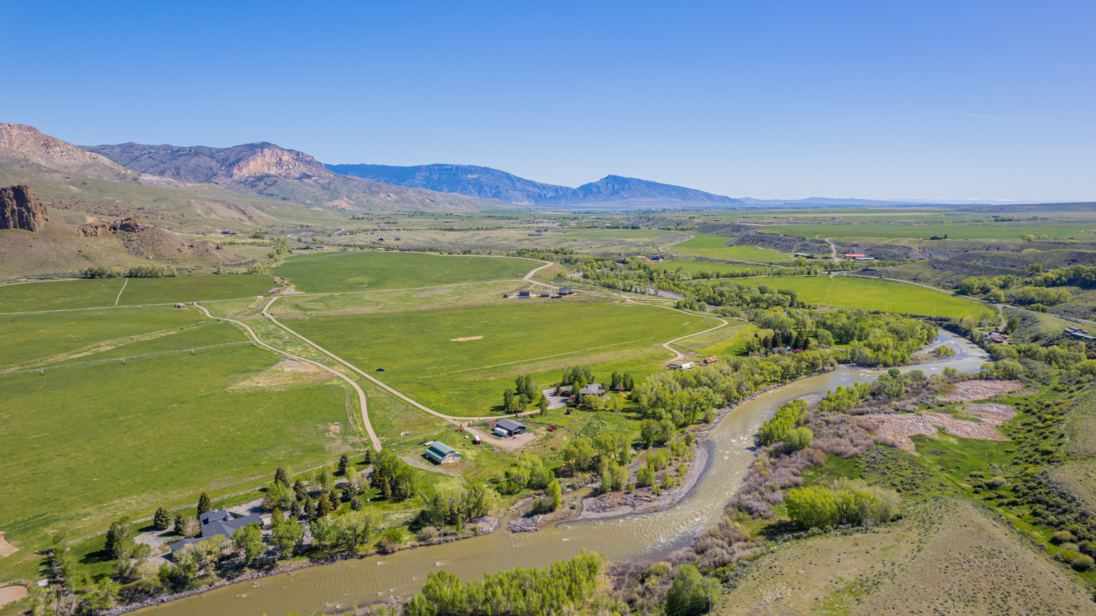 The 22 Castle Rock sits on ยฑ42.18 nutrient-rich acres, divided into two fenced pastures, with +950 feet of river frontage and spectacular views in every direction. With +33.6 acres of water rights currently distributed by two-wheel lines and pulled from a well-maintained pump housed at the riverโs edge, the ranch can produce approximately 30 tons of hay. Manicured lawns and gardens surrounding the home are separated from the pastures by post and rail and buck-n-rail fencing down to the riverโs edge. Gracing the riverbanks and enjoying the comfortable shade of cottonwood trees, a picnic table and firepit await the laughter of family and friends.