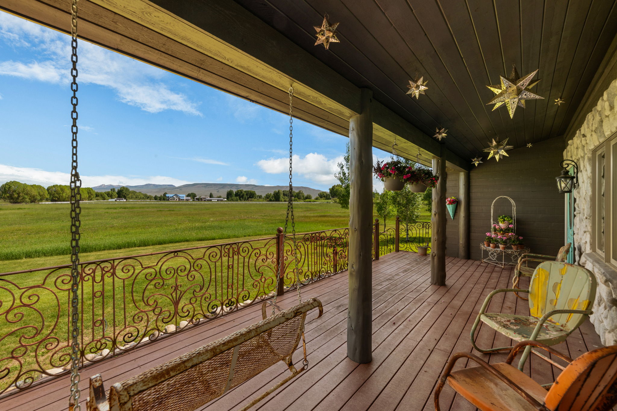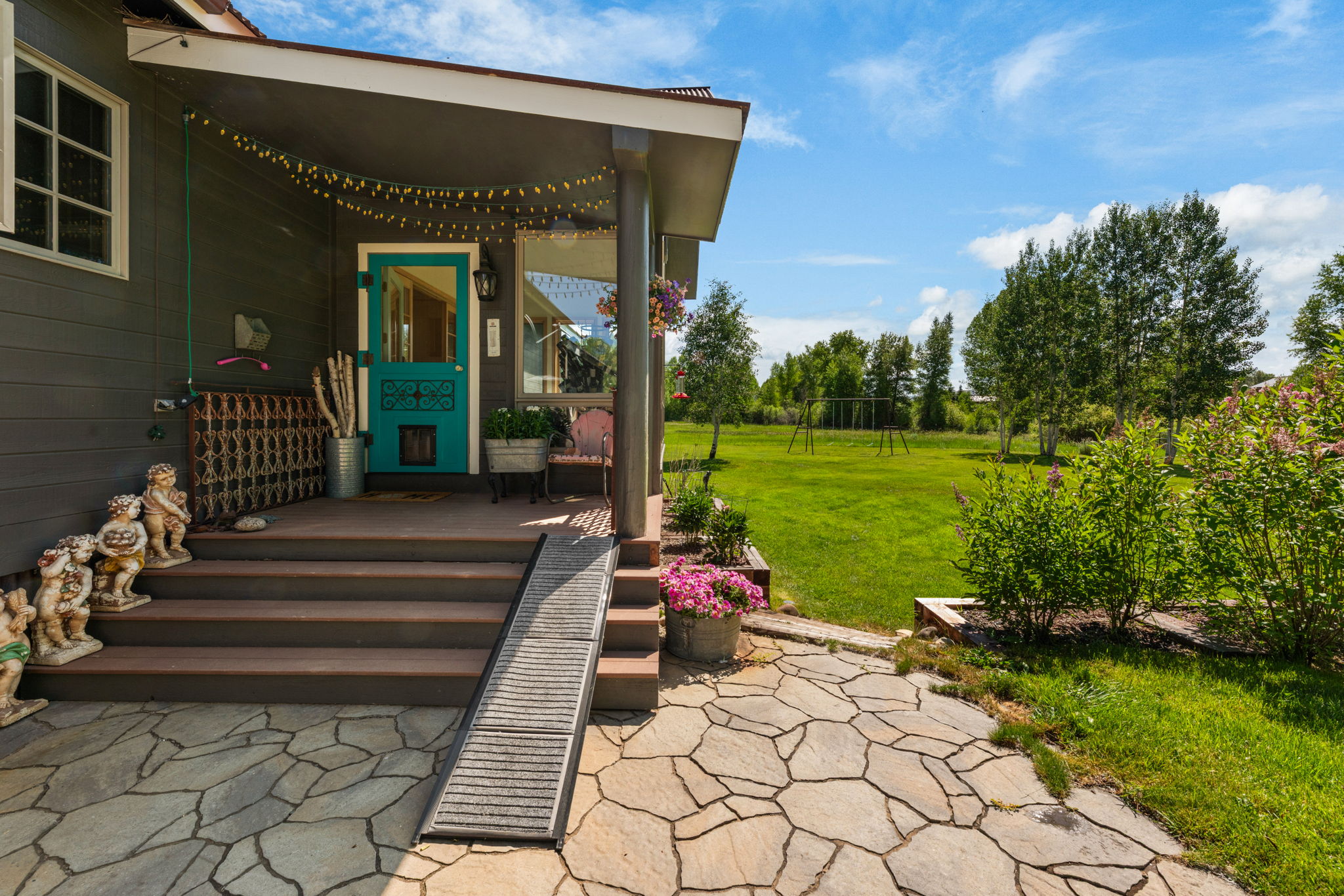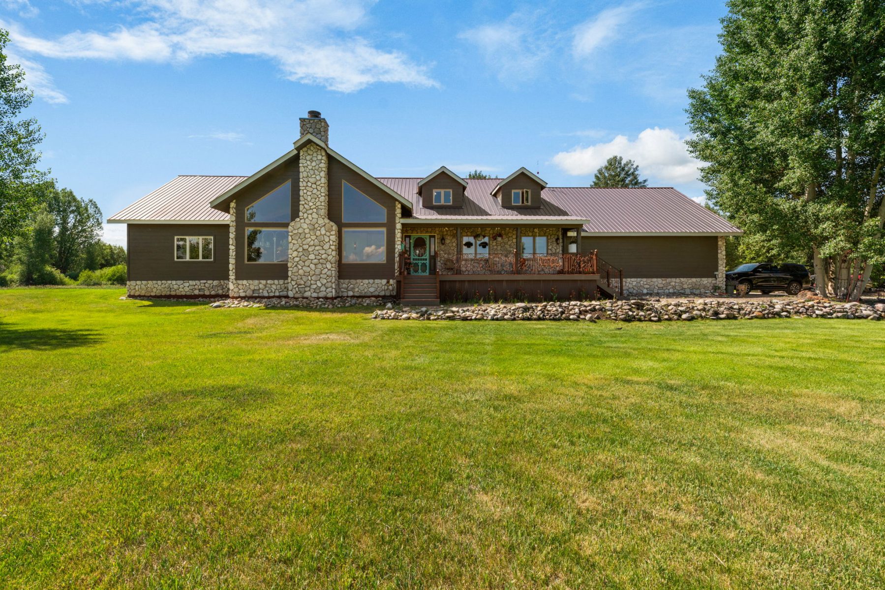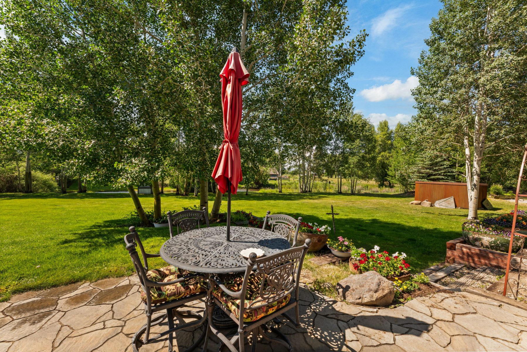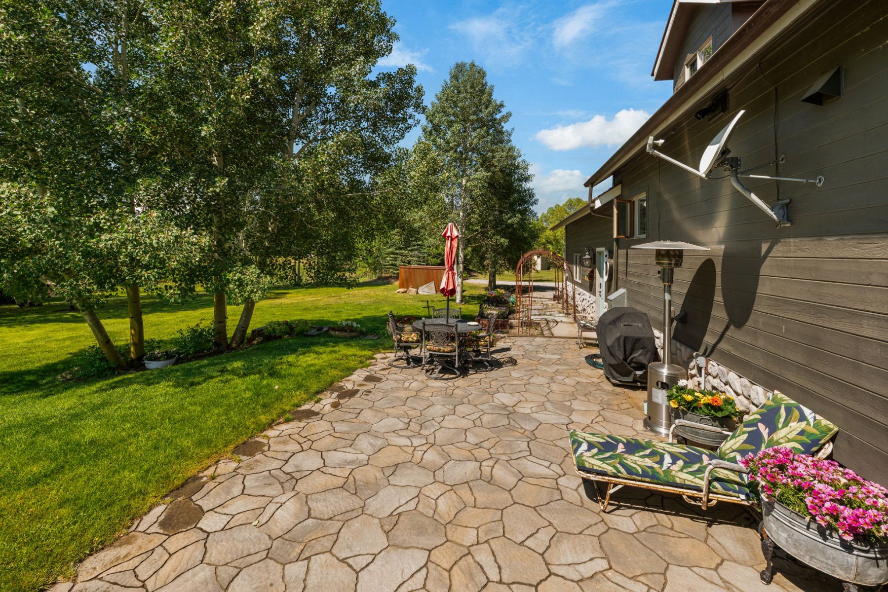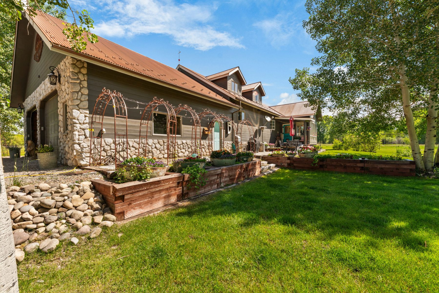 - Additional highlights include: substantial water rights for irrigation, in-floor radiant heating throughout, an oversized, heated two-car garage, two large storage containers, expansive flagstone patio, and no HOA restrictions