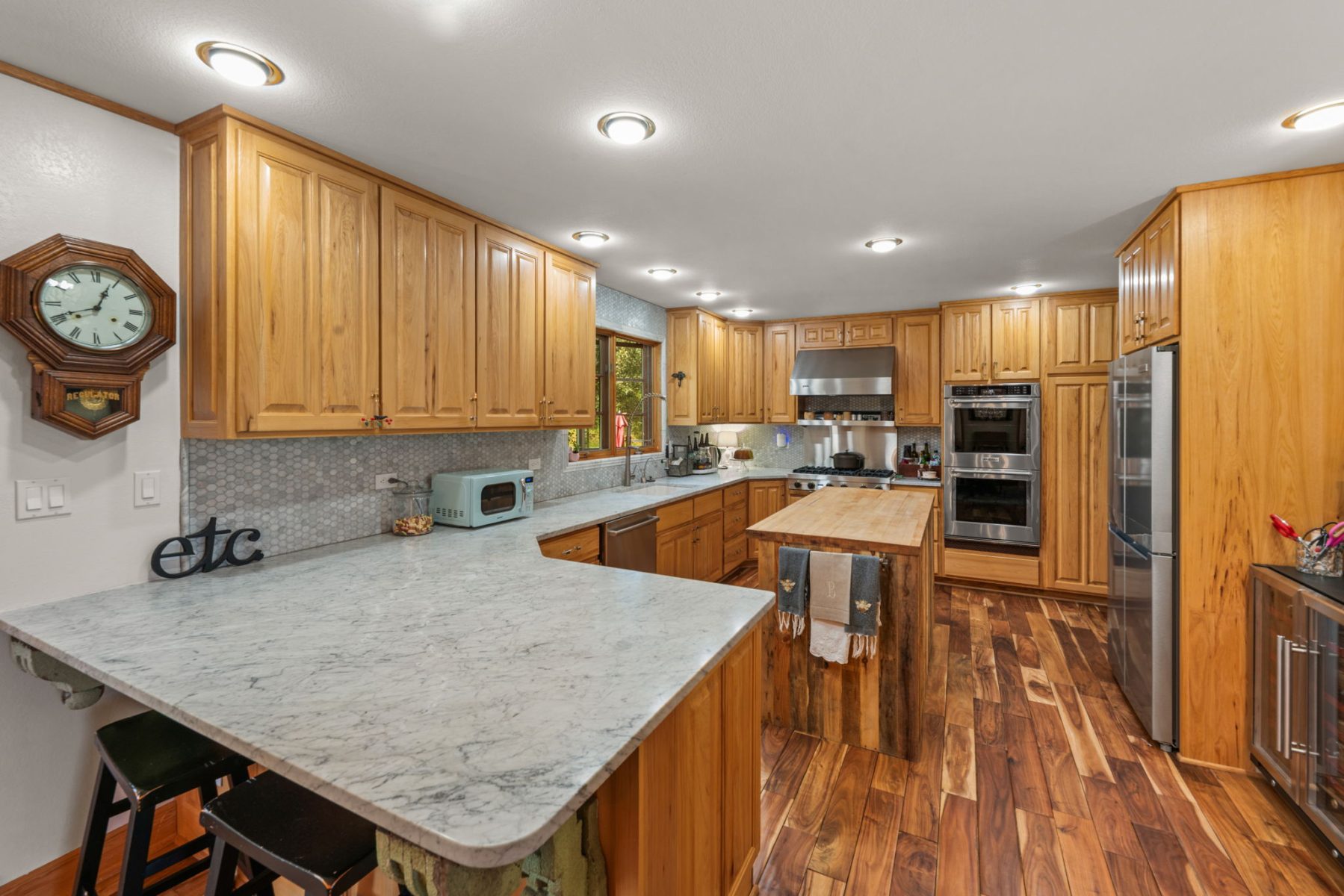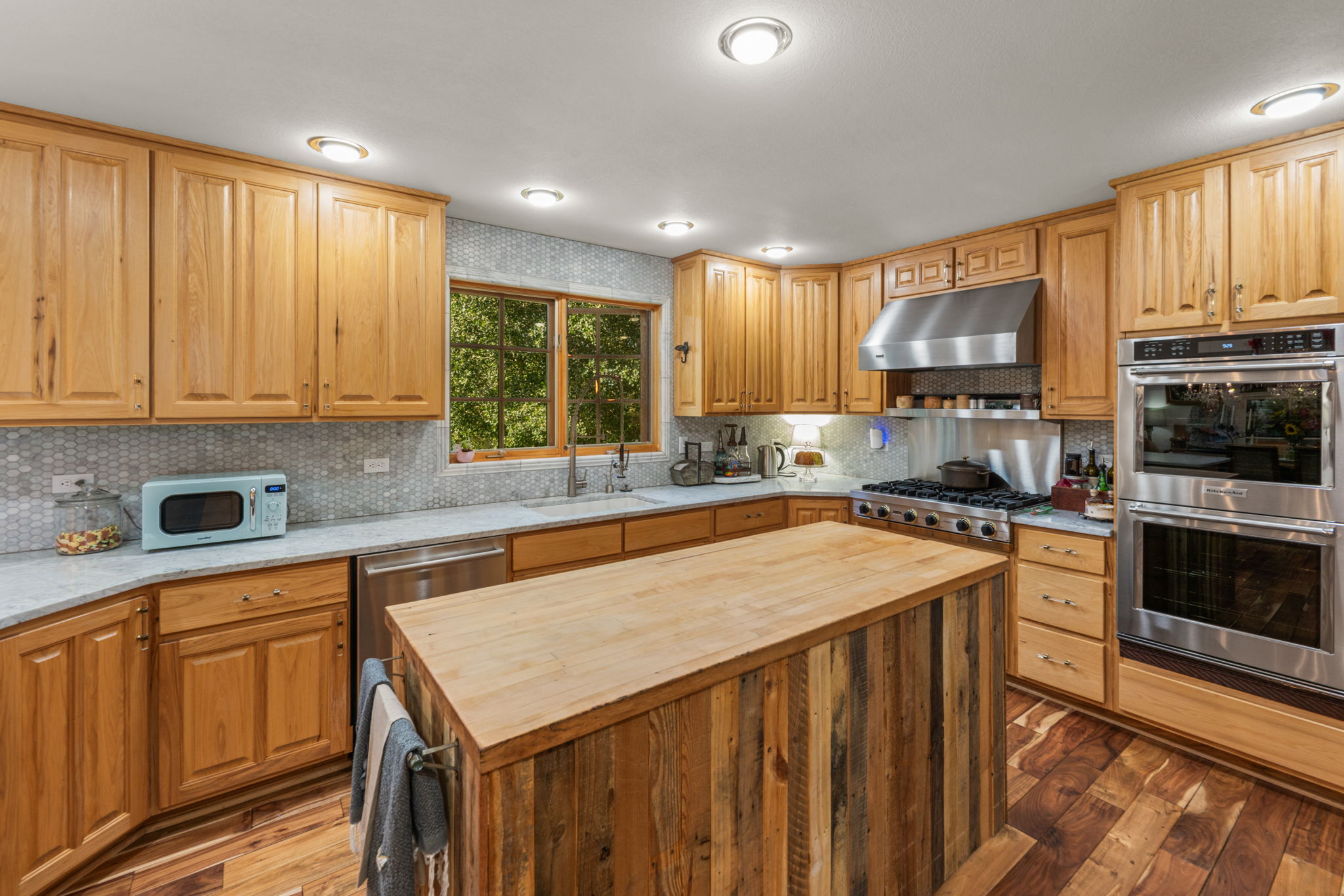 - The kitchen features Carrera marble countertops, a butcher block island with a built-in ice maker, double ovens, and a gas range