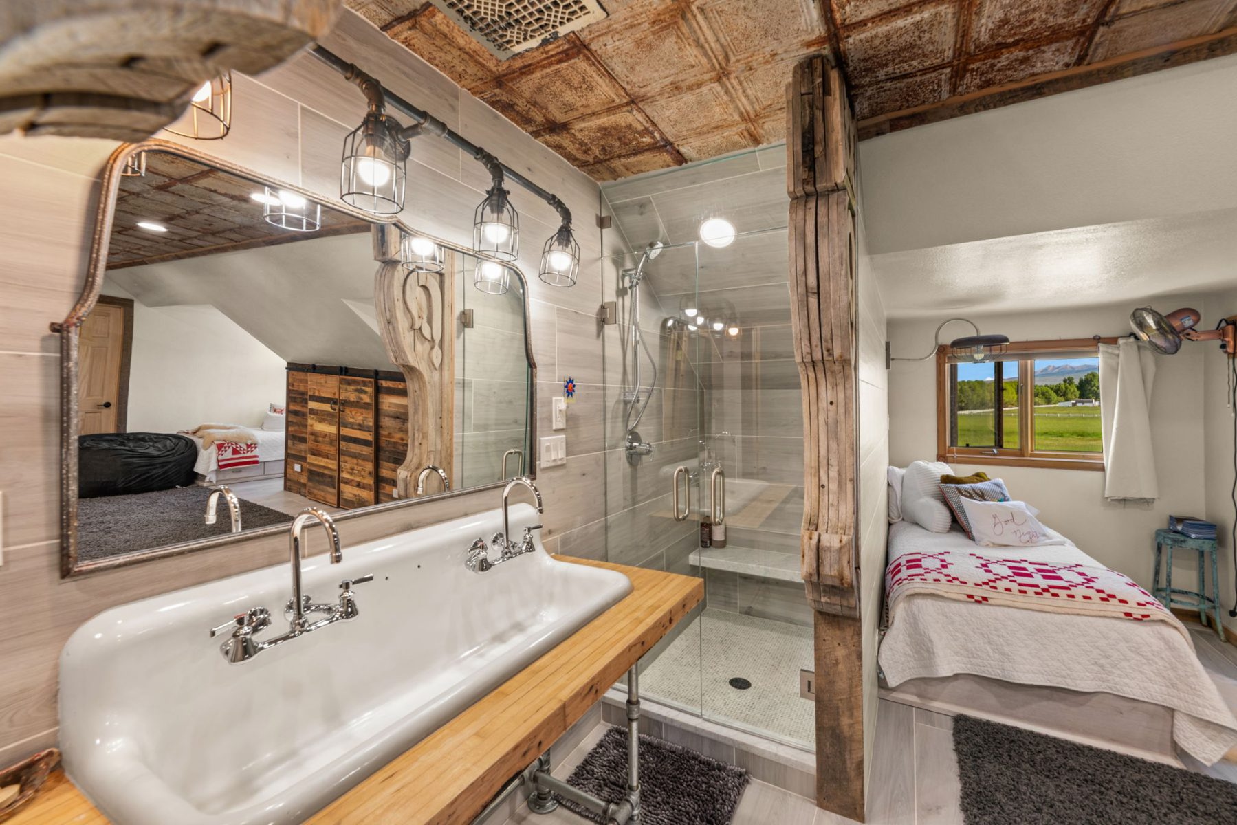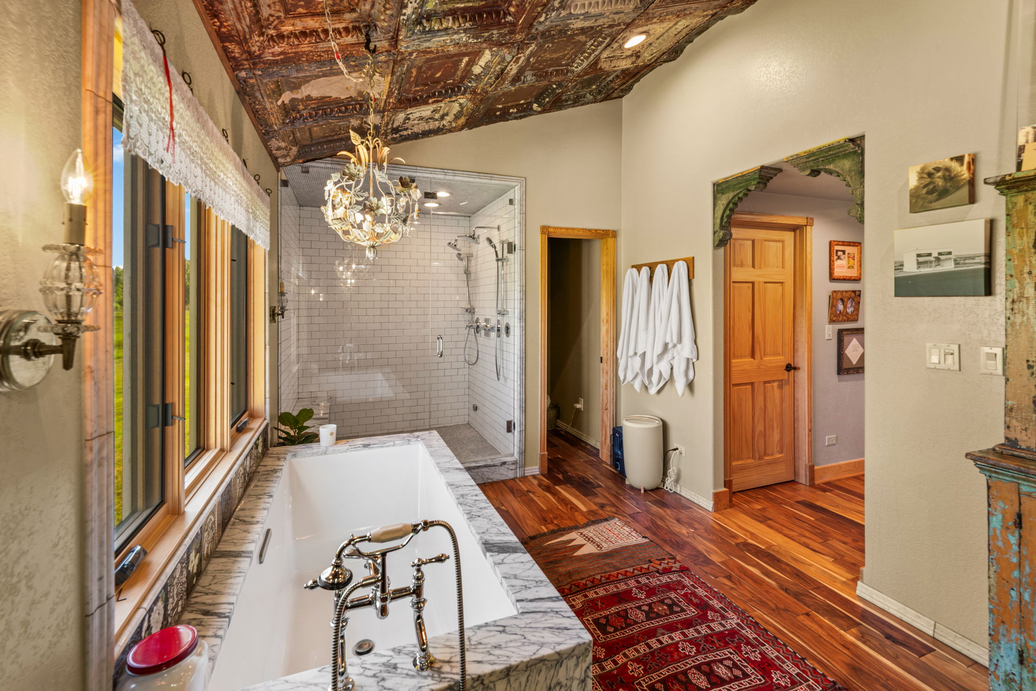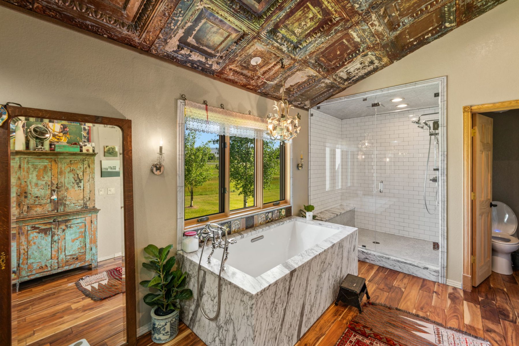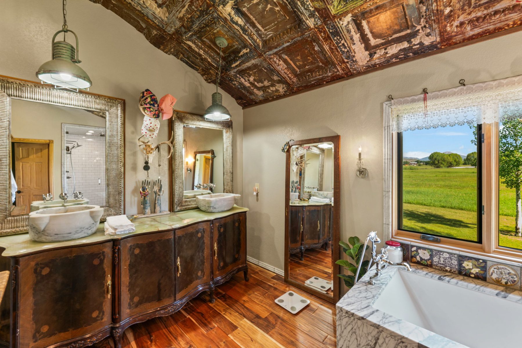 - A luxury primary suite with western character, custom wood and metal details and a spa-like en-suite bathroom with an antique double sink vanity, a marble-wrapped soaking tub, and spacious steam shower with dual shower heads and a bench