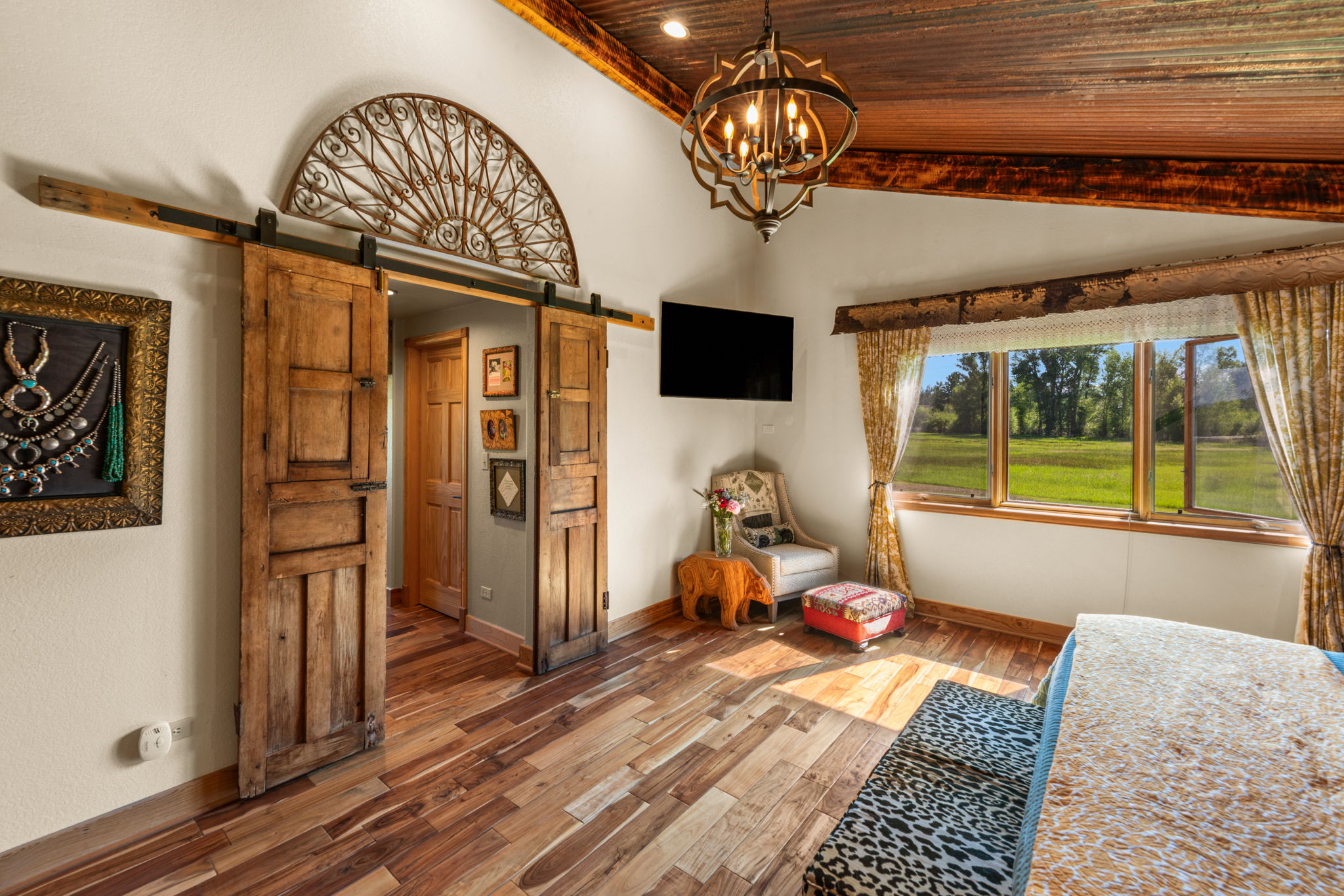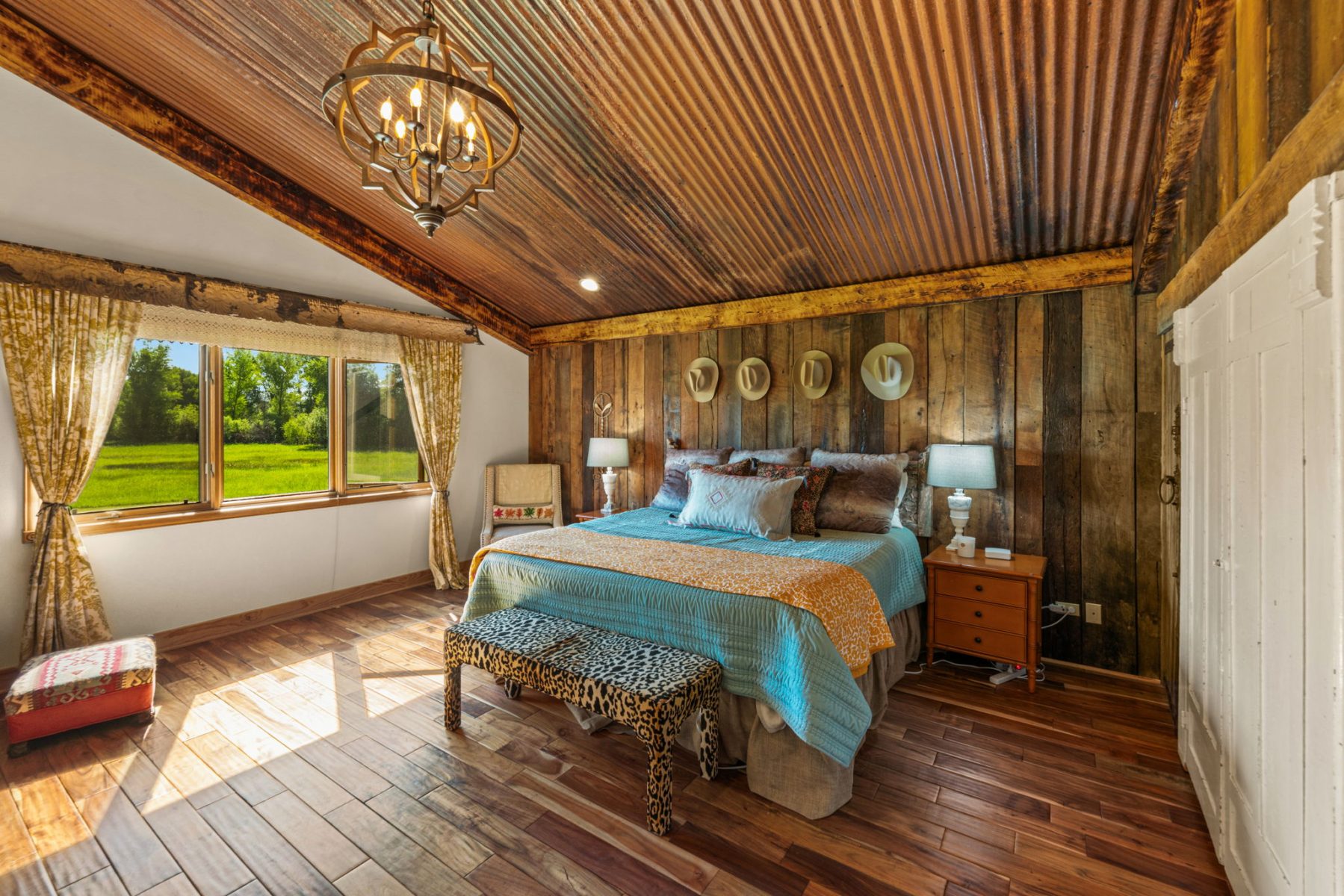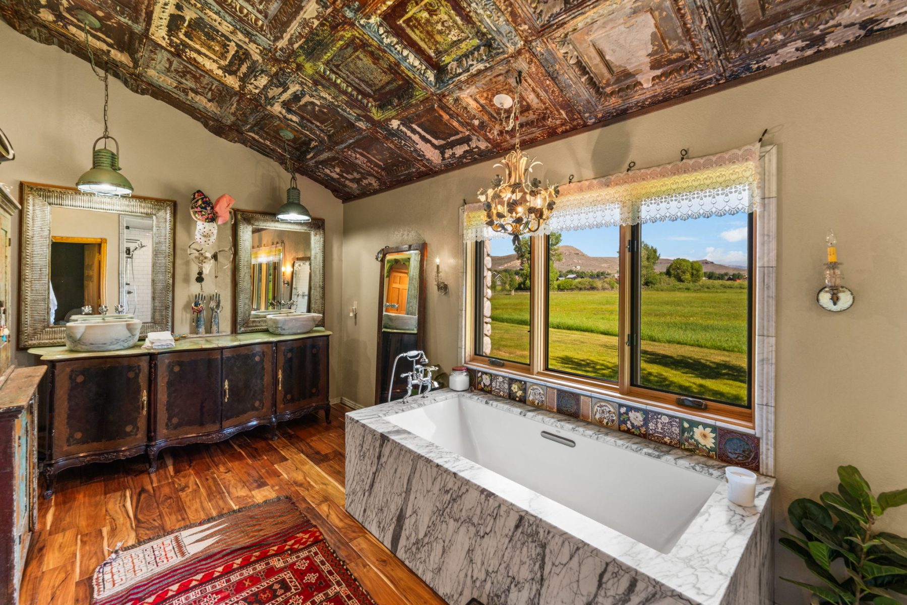 - A luxury primary suite with western character, custom wood and metal details and a spa-like en-suite bathroom with an antique double sink vanity, a marble-wrapped soaking tub, and spacious steam shower with dual shower heads and a bench