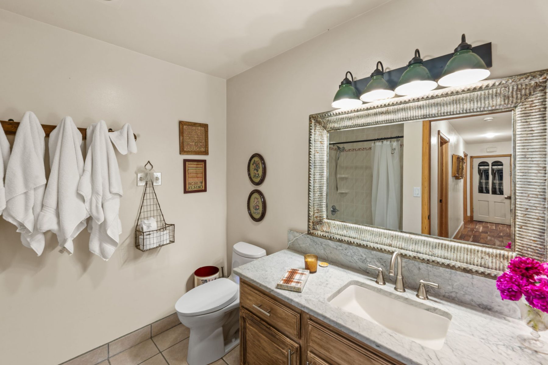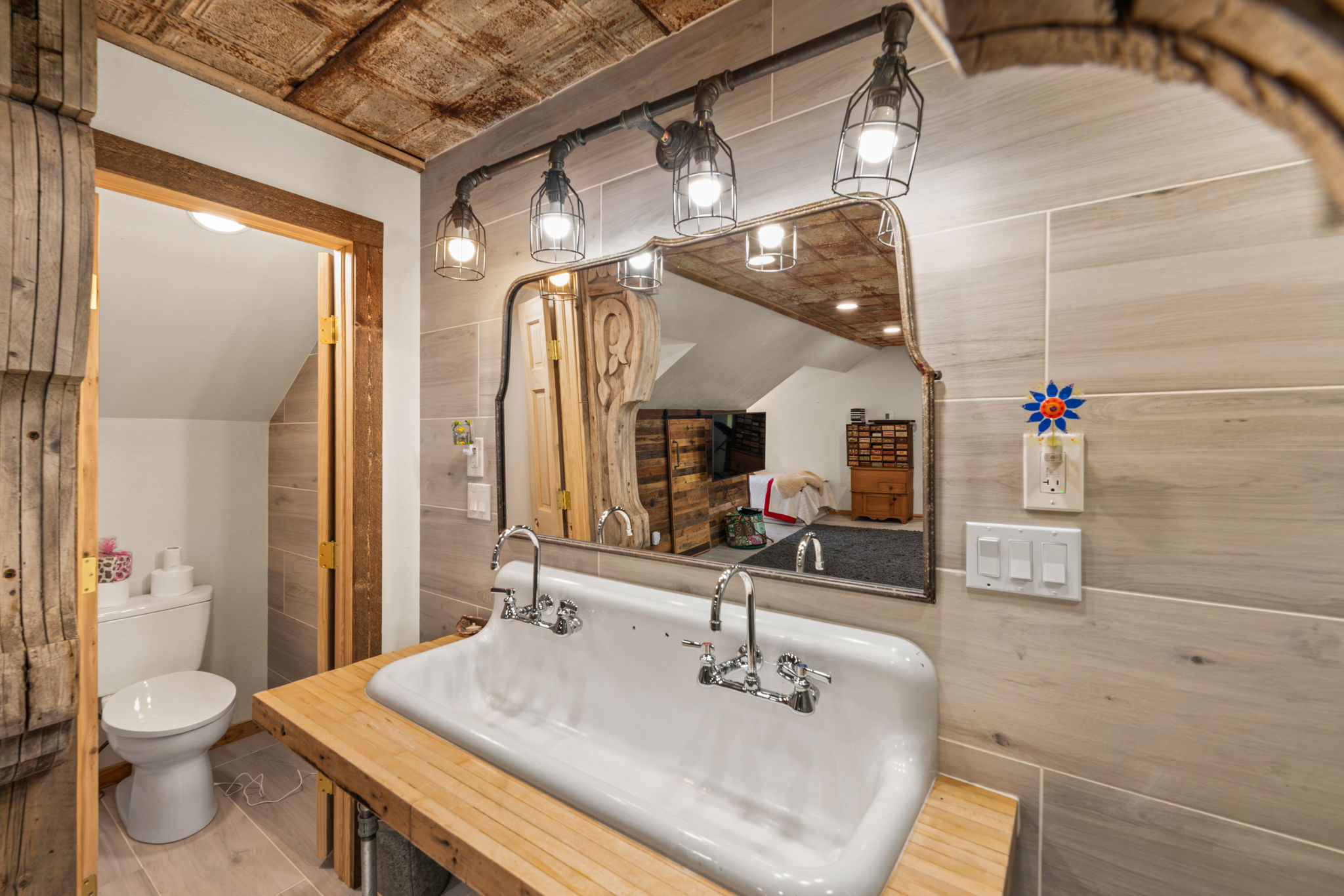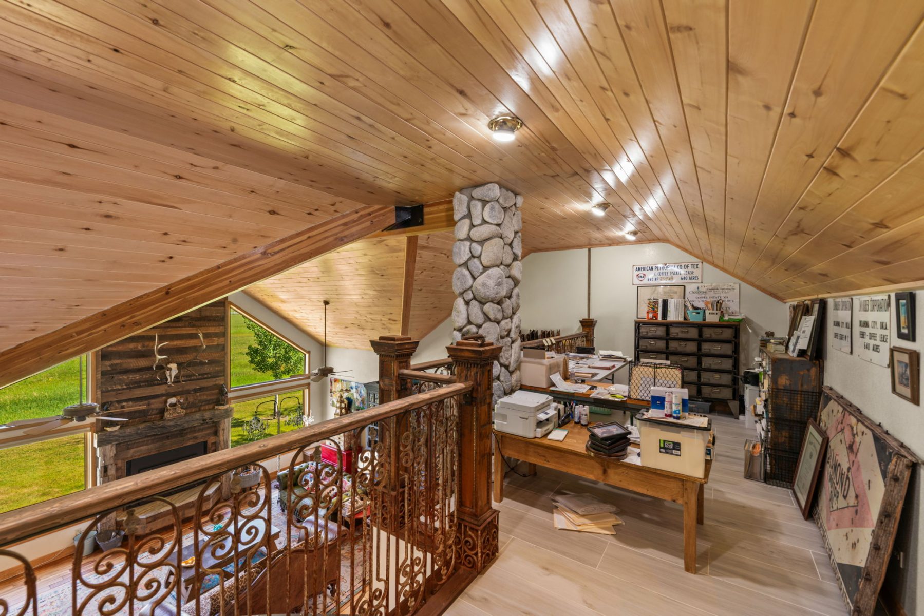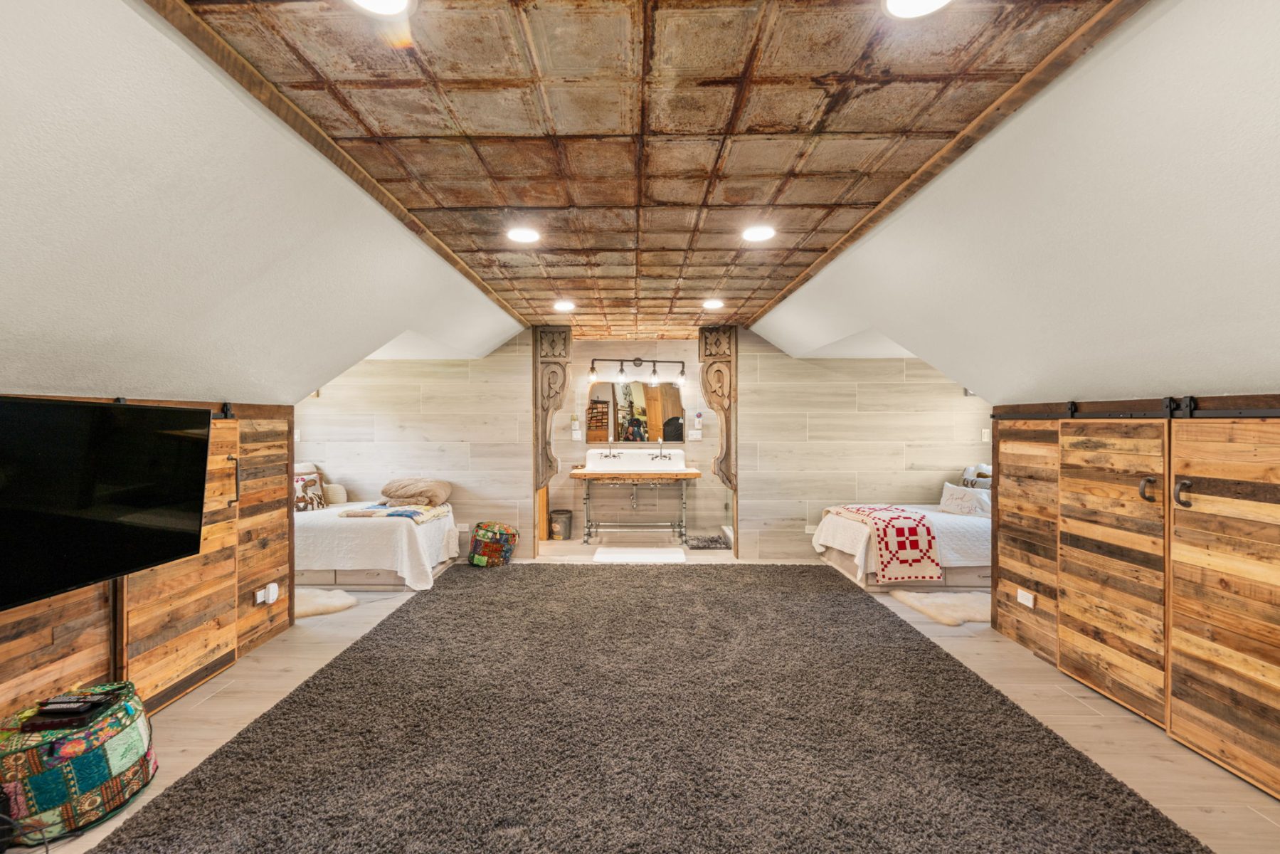 - A luxury primary suite with western character, custom wood and metal details and a spa-like en-suite bathroom with an antique double sink vanity, a marble-wrapped soaking tub, and spacious steam shower with dual shower heads and a bench