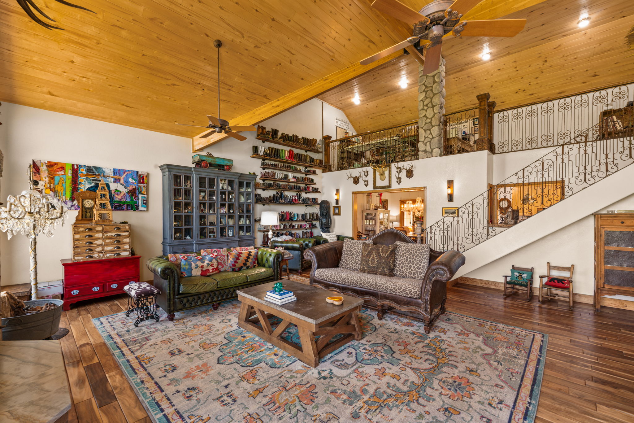 - Large living room with vaulted ceilings, floor-to-ceiling windows, and a striking gas fireplace that as the perfect centerpiece for gathering or relaxing