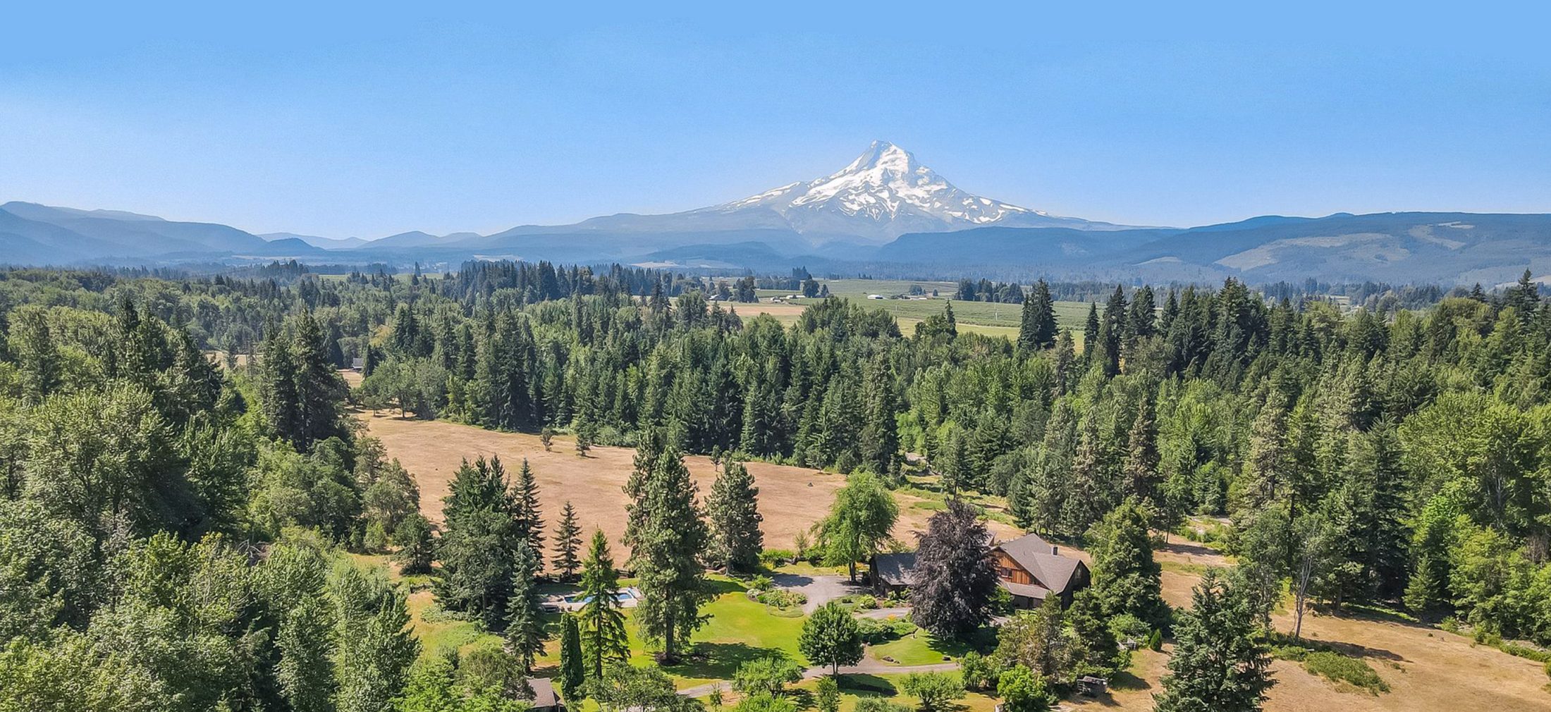 With meadows and wildflowers enveloped by native oak and fir forest and flanked by the East Fork Hood River to the west and towering Mount Hood to the south, Elk Haven is the ideal respite for wildlife and the perfect escape for family, friends, and group entertainment. An incredible offering, this exceptional 55-acre estate, surrounded by private farm and forested parcels, includes a main house constructed in the 1970s, the original farmhouse used by guests or caretakers constructed in 1938, a large covered riding arena, a four-stall barn with tack room, an original hay barn built at the turn of the 20th century, chicken coop, fenced pasture, and smaller two-stall horse barn and pool house. Tieman Creek runs along the eastern flank of the property, and the western flank contains a large, forested island surrounded by the main channel and side channel of the East Fork Hood River. Elk Haven feels completely secluded and offers incredible privacy yet lies only fifteen minutes from the recreational epicenter of Hood River and ten minutes from Parkdale, an excellent cup of coffee, incredible microbrews, wineries, restaurants, farmstands, and all of your grocery and supply needs. Beyond its fence is a sea of over one million acres of public land to enjoy every recreational pursuit that the Hood River Valley and Columbia Gorge are globally renowned for.
