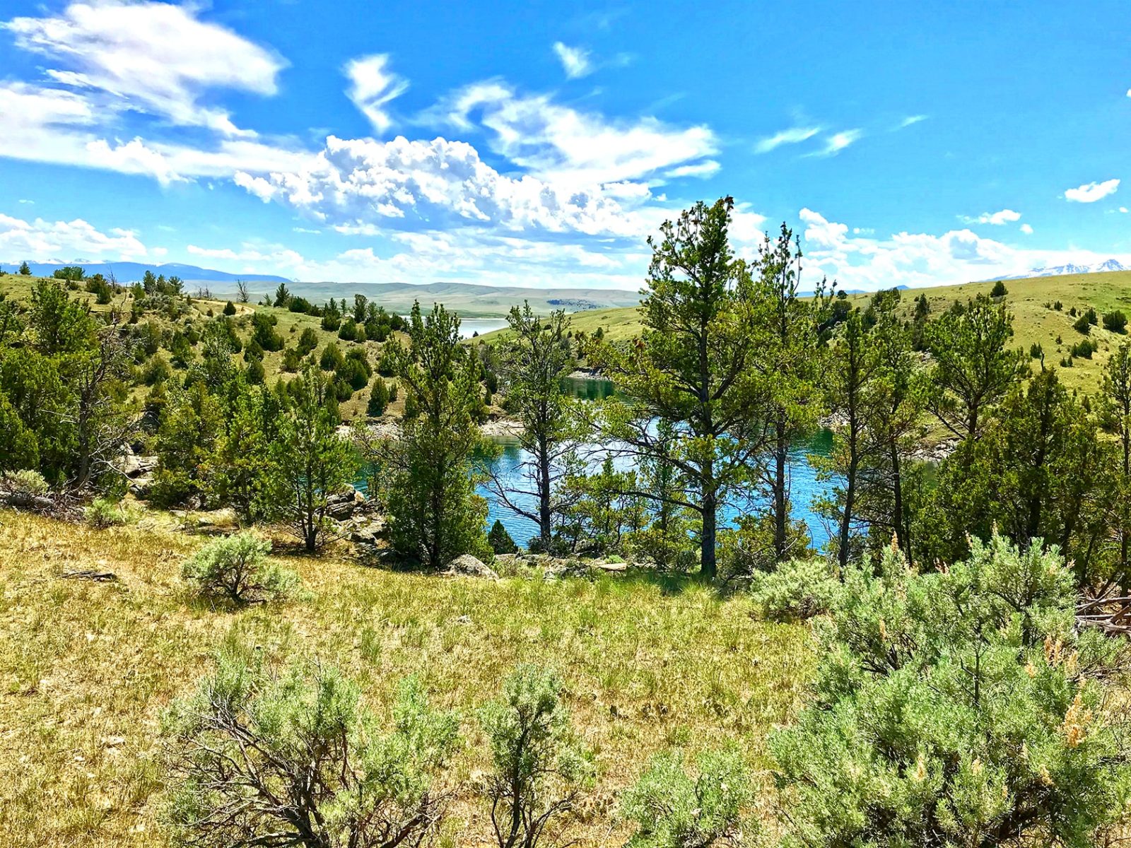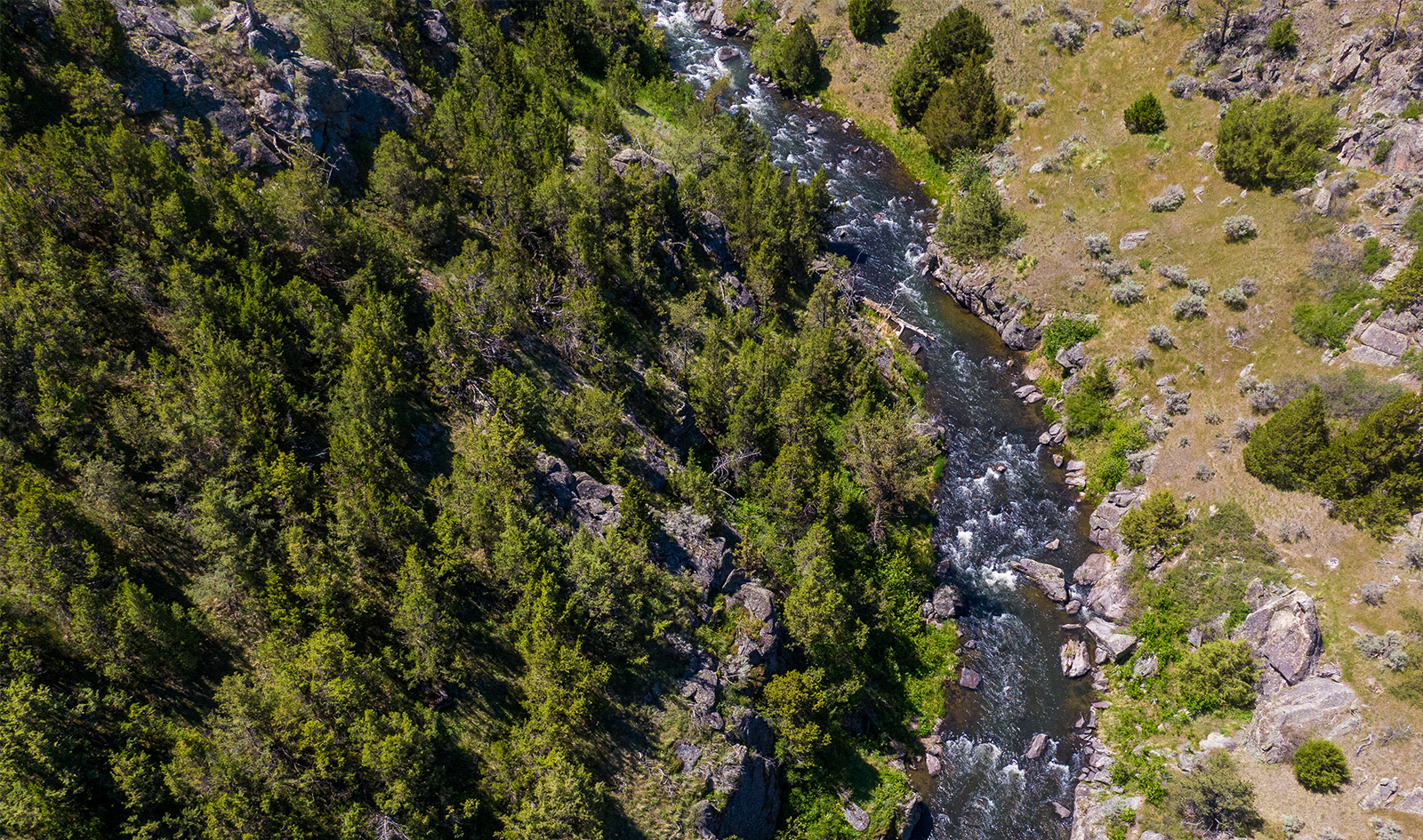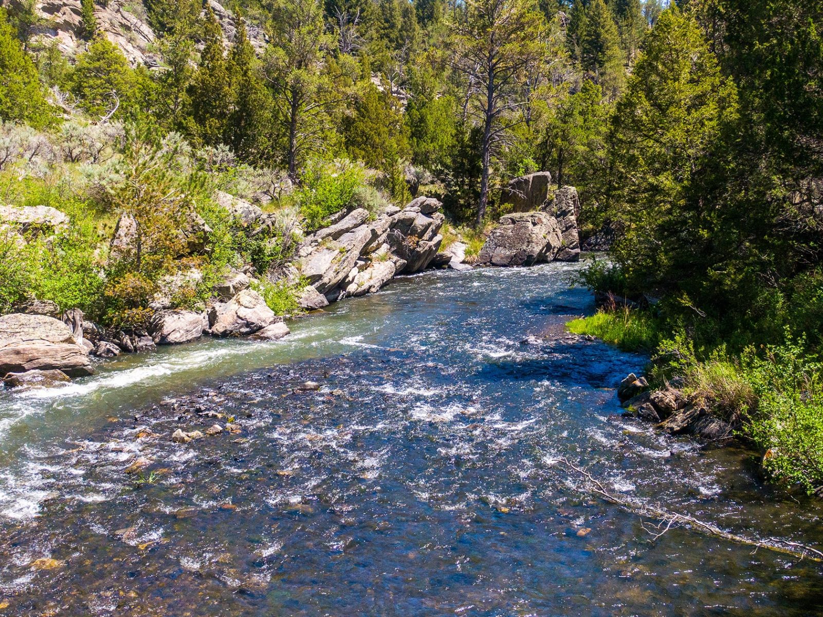 While the Harwood Ranch is positioned at the epicenter of some of the finest trout fishing country in the world, within its borders, the ranch features an outstanding fishery in its own right. Approximately 6ยฑ meandering miles of choice tailwater fishery flows through the heart of the Harwood Ranch. The ranchโs ownership is on both sides of the creek essentially creating a private fishing venue, and the impracticability of public access due to topography is a huge asset in a state where stream access laws are fairly liberal concerning public use. The ranch directly borders the dam on Harrison Lake, an irrigation storage impoundment built in 1938. The dam is bottom-discharging, so cold, clear water in the creek is the norm year-around. The upper 4ยฑ miles of the creek winds through the rugged canyon offering a compelling mix of prime trout habitat; enticing riffles and boulder pocket water, undercut banks and rock ledges, and deeper pools with long tailouts. Vehicular access points at both the canyon mouth and top end of the canyon by the dam are connected by a walking trail. There are also a few access points to the water in the mid-canyon, albeit these require more of a hike. Once the creek exits the canyon, the gradient lessens, and the stream meanders through approximately 2ยฑ miles of grass meadows and agricultural ground. The creek supports a healthy resident trout fishery consisting of brown and rainbow trout that mostly run between 8โ-18โ, with an occasional fish exceeding that size. There is good dry fly fishing due to consistent caddis and mayfly hatches throughout the summer, and terrestrials – grasshoppers, beetles and ants – are major food items for the fish during the warmer months as well. Any number of nymph and streamer patterns are always excellent options and consistent producers on the stream. In a nutshell, the fish are generally very receptive to a variety of different fly patterns.