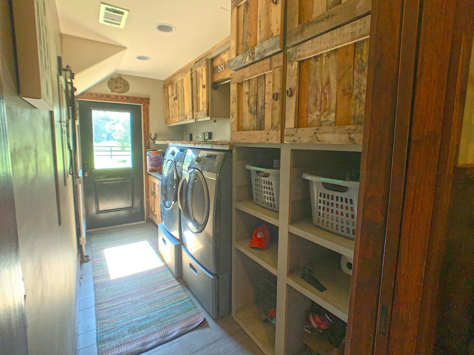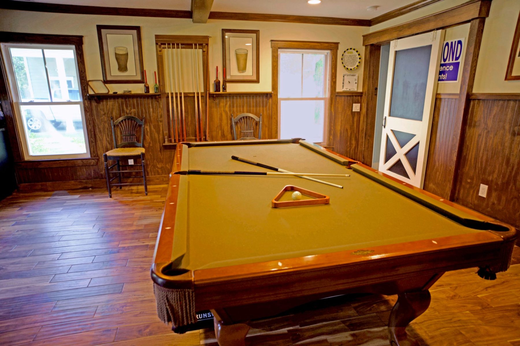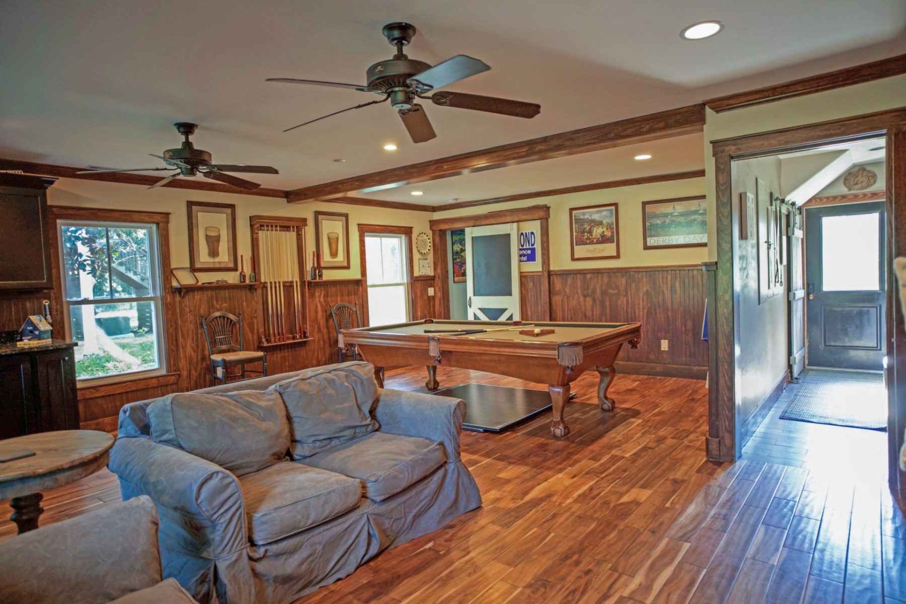 The five-bedroom house features large living spaces, custom millwork including cabinetry and sliding barn doors, walnut flooring, two fireplaces, and large porches on both floors. The property also has a detached two-car garage and a game room that can be used as guest quarters.