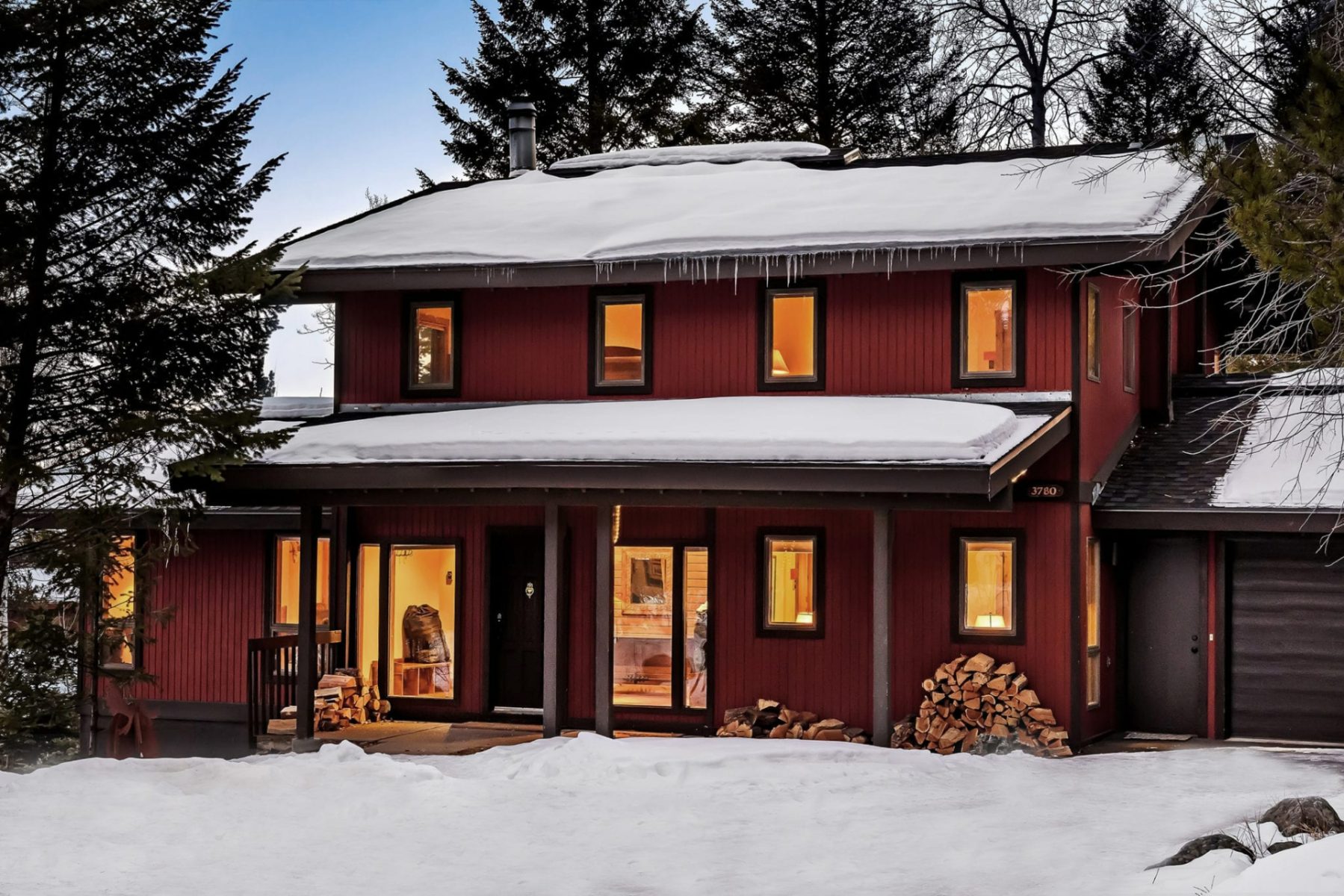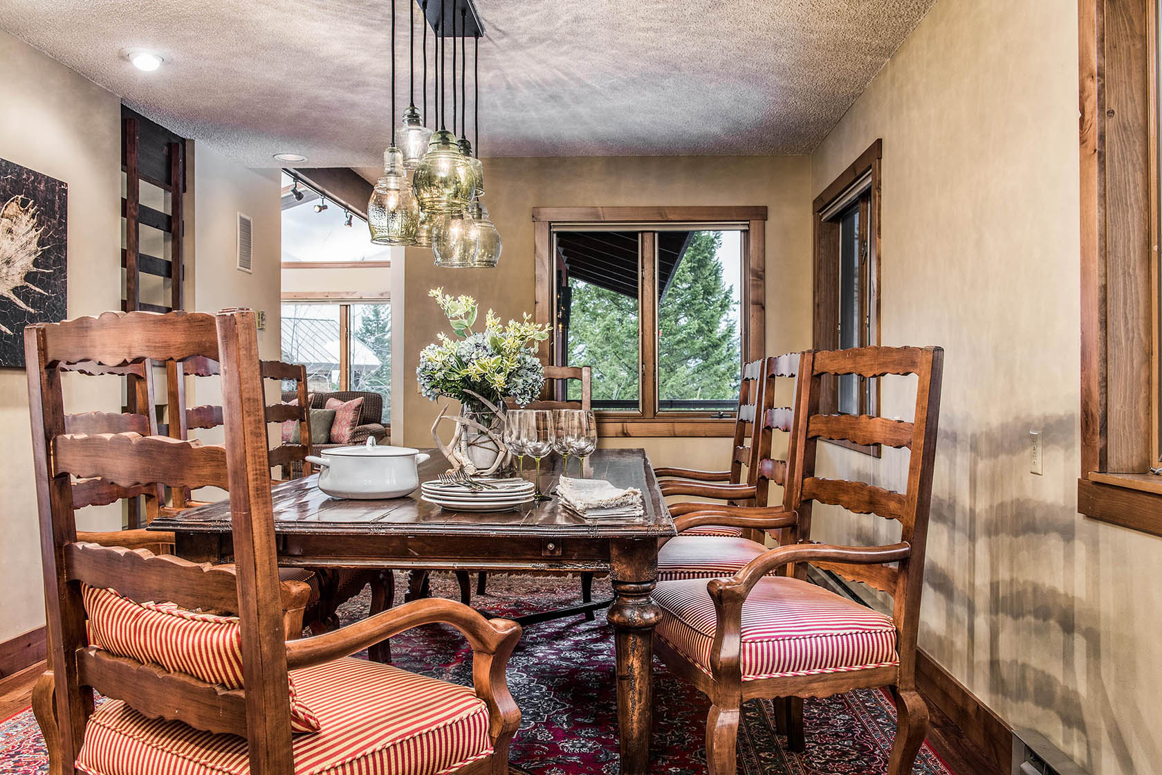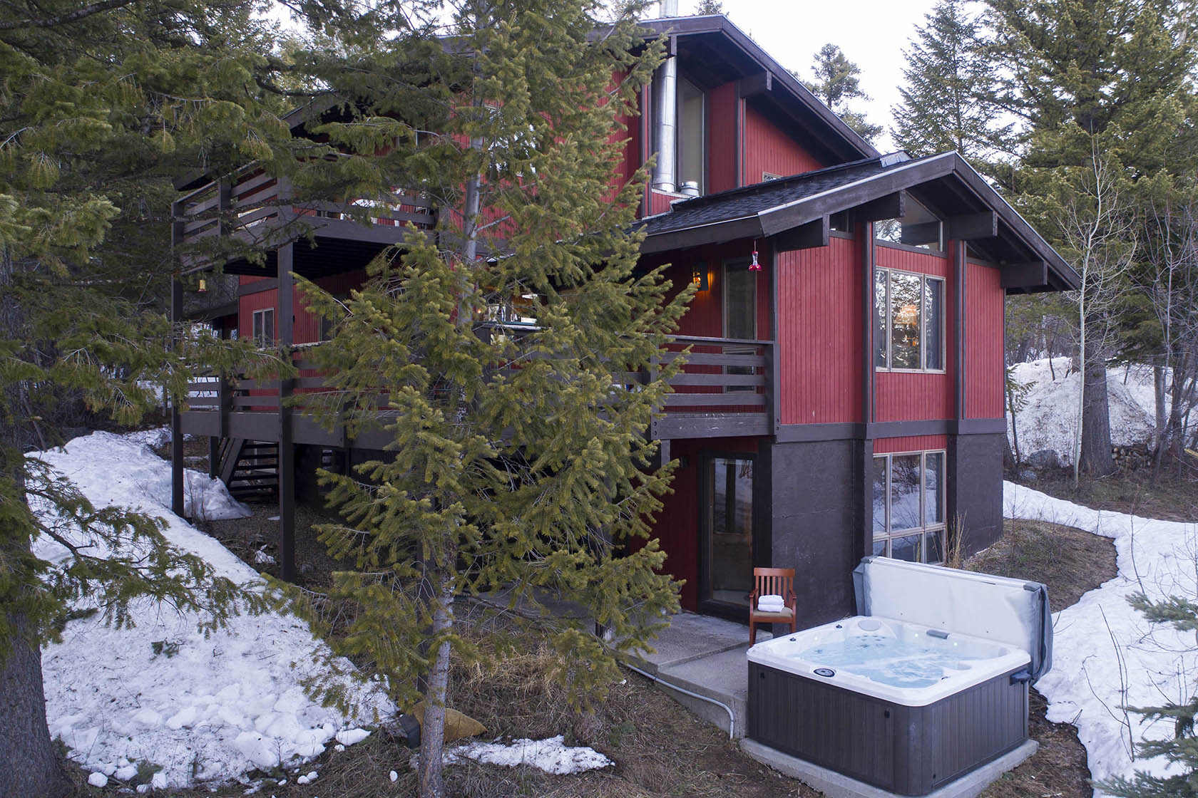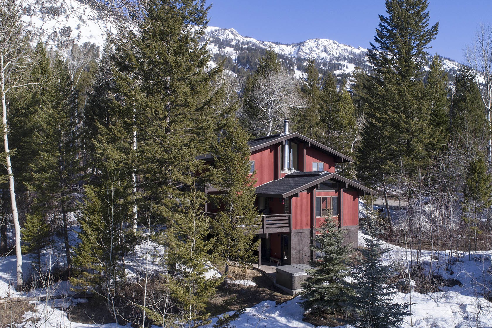 This five-bedroom, ready-to-rent, ski chalet combines old-world charm and modern access at the world-class Jackson Hole Mountain Resort. Catch a ride from the Moose Creek ski lift in the winter, or start your hike from the backyard in the summer and walk home from dinner in Teton Village. Soak in the hot tub off the downstairs master bedroom and media room, which doubles as a 6th bedroom. Two other en-suite bedrooms, one with a private deck, are separated by the three-story floor plan, providing privacy for guests. New stainless steel appliances will please the chef in the kitchen and heated floors add warmth. Curl up on the couch by the wood-burning fireplace in the den – the perfect place for an afternoon nap. The intimate dining room has a table set for eight with woodsy views out the windows.