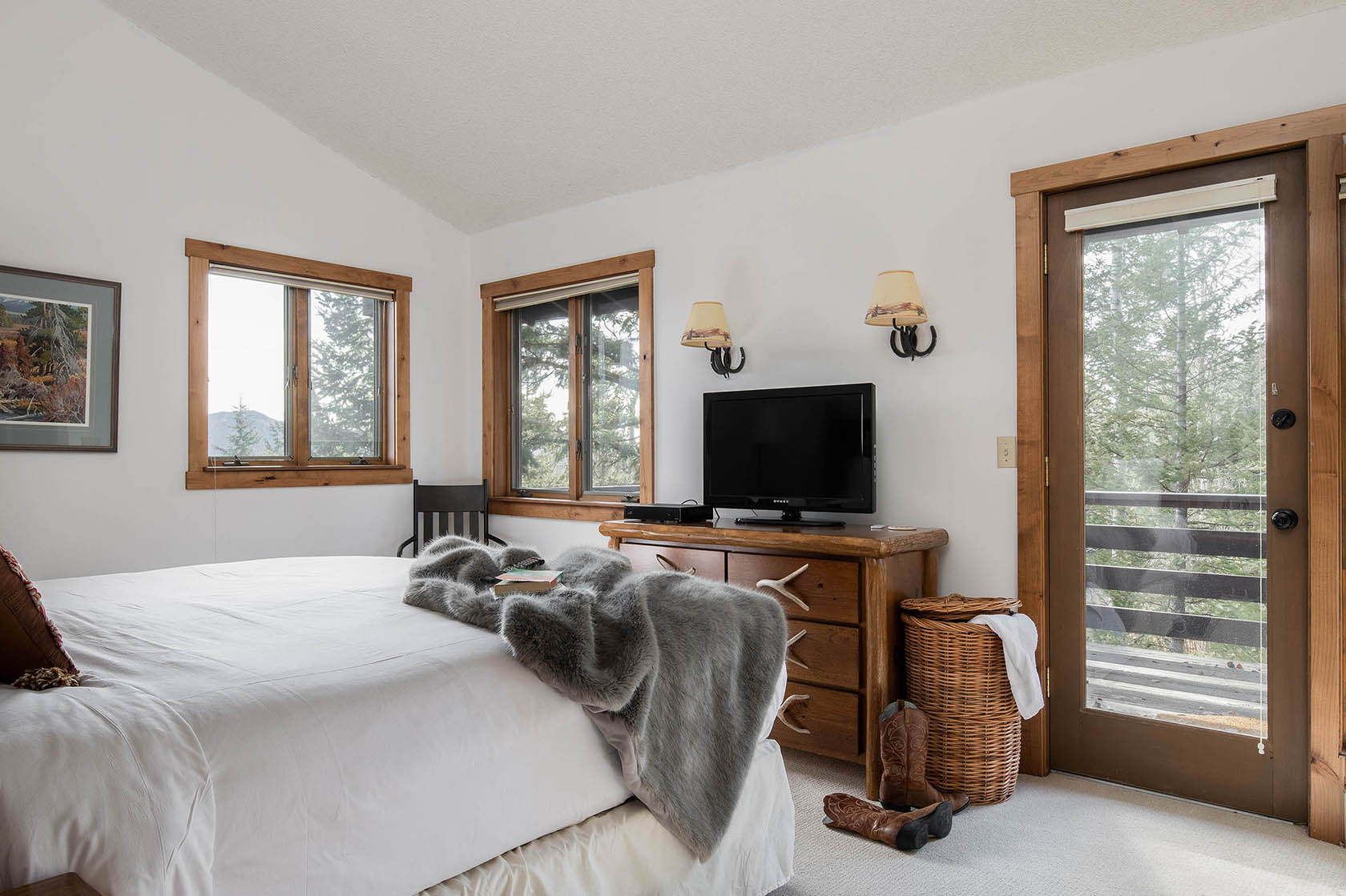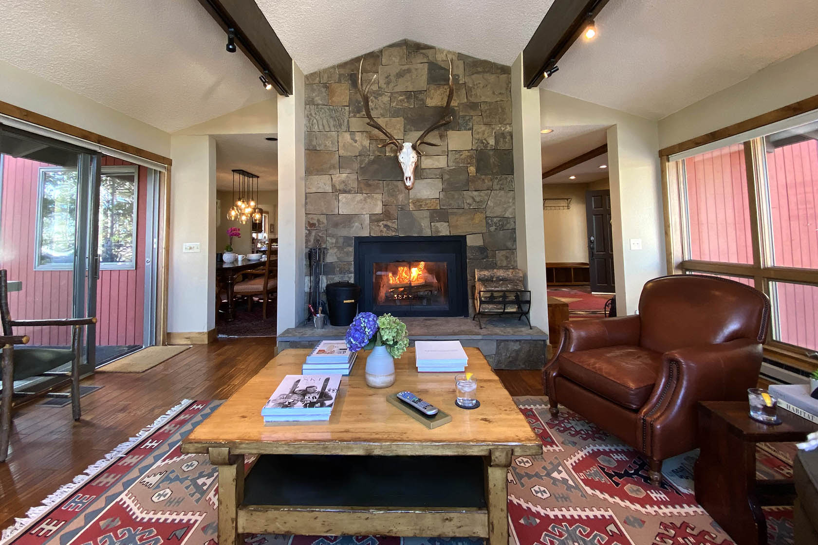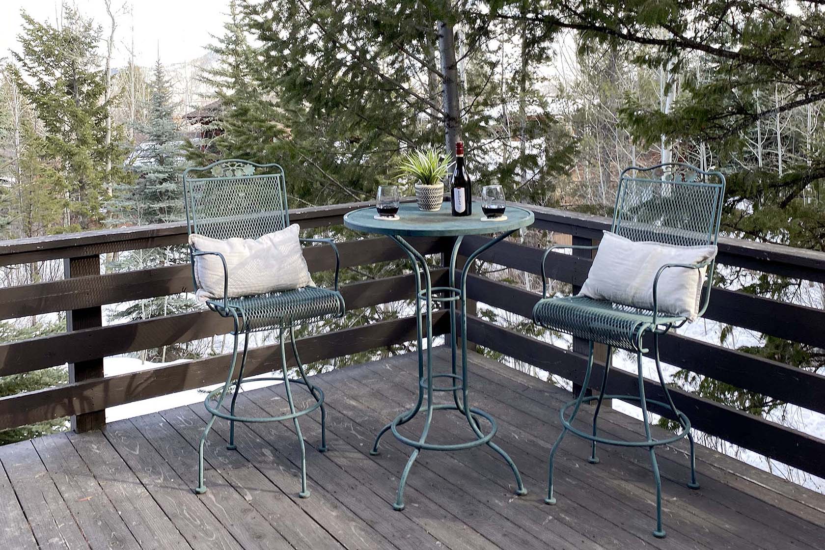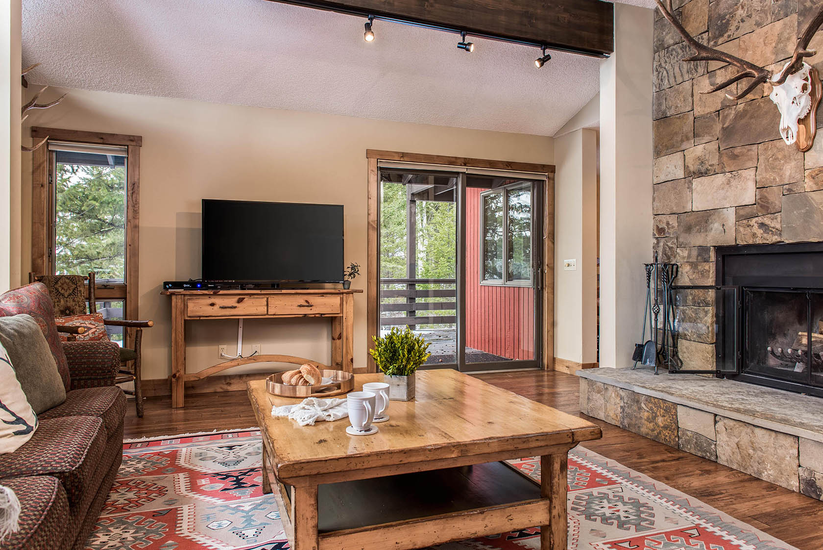 This five-bedroom, ready-to-rent, ski chalet combines old-world charm and modern access at the world-class Jackson Hole Mountain Resort. Catch a ride from the Moose Creek ski lift in the winter, or start your hike from the backyard in the summer and walk home from dinner in Teton Village. Soak in the hot tub off the downstairs master bedroom and media room, which doubles as a 6th bedroom. Two other en-suite bedrooms, one with a private deck, are separated by the three-story floor plan, providing privacy for guests. New stainless steel appliances will please the chef in the kitchen and heated floors add warmth. Curl up on the couch by the wood-burning fireplace in the den – the perfect place for an afternoon nap. The intimate dining room has a table set for eight with woodsy views out the windows.