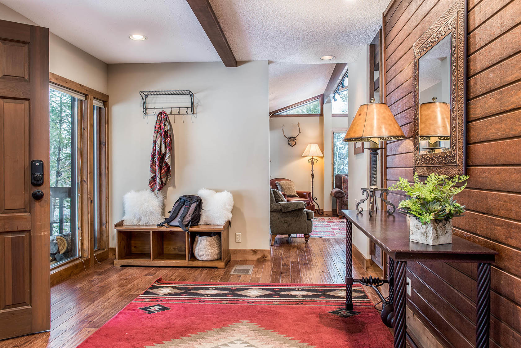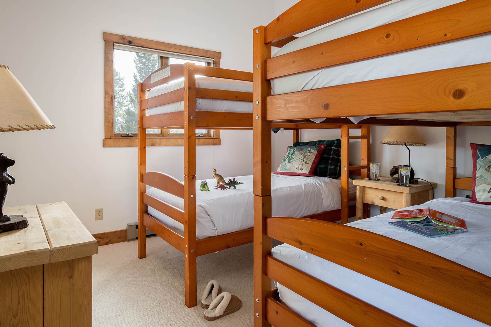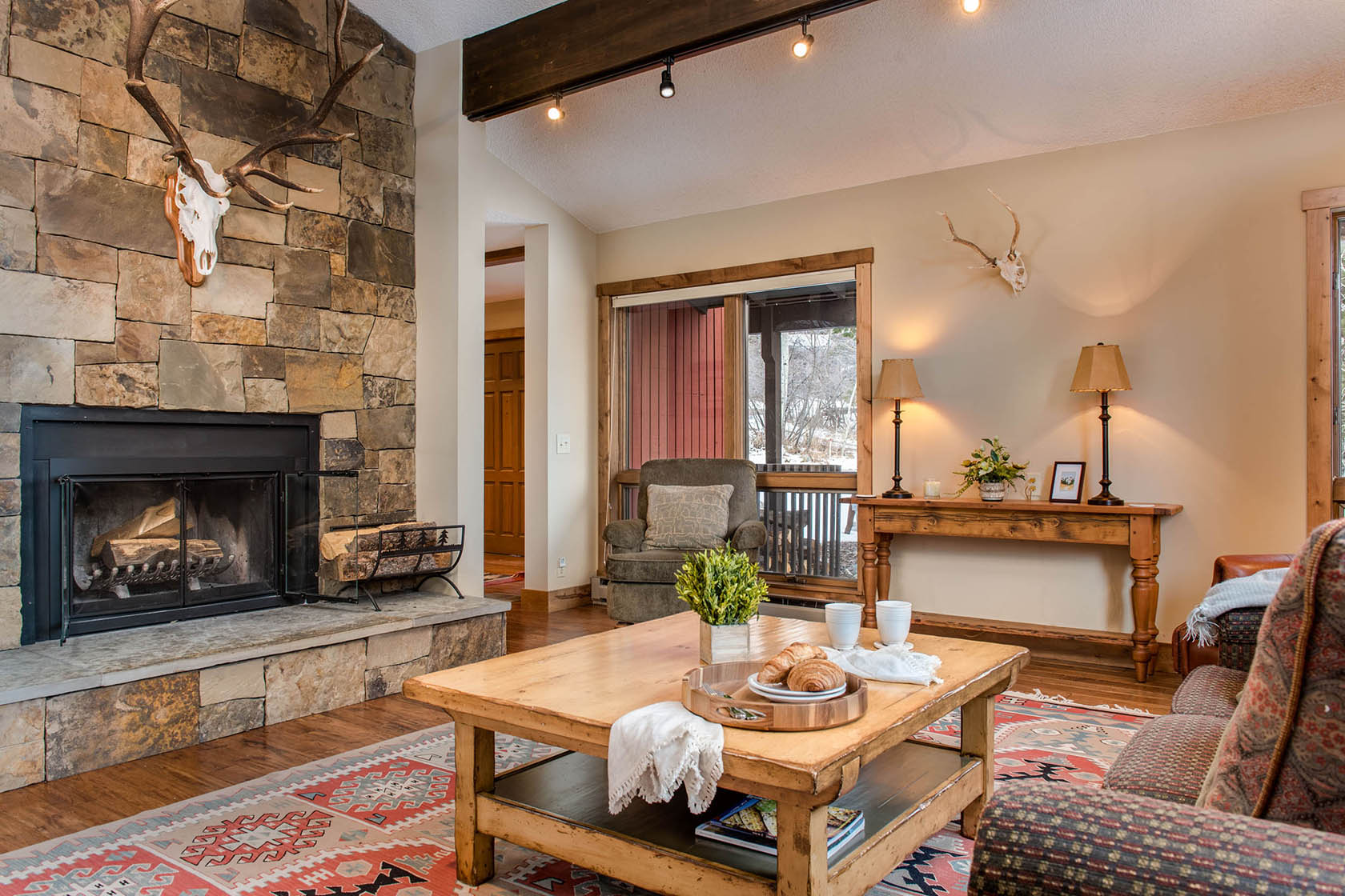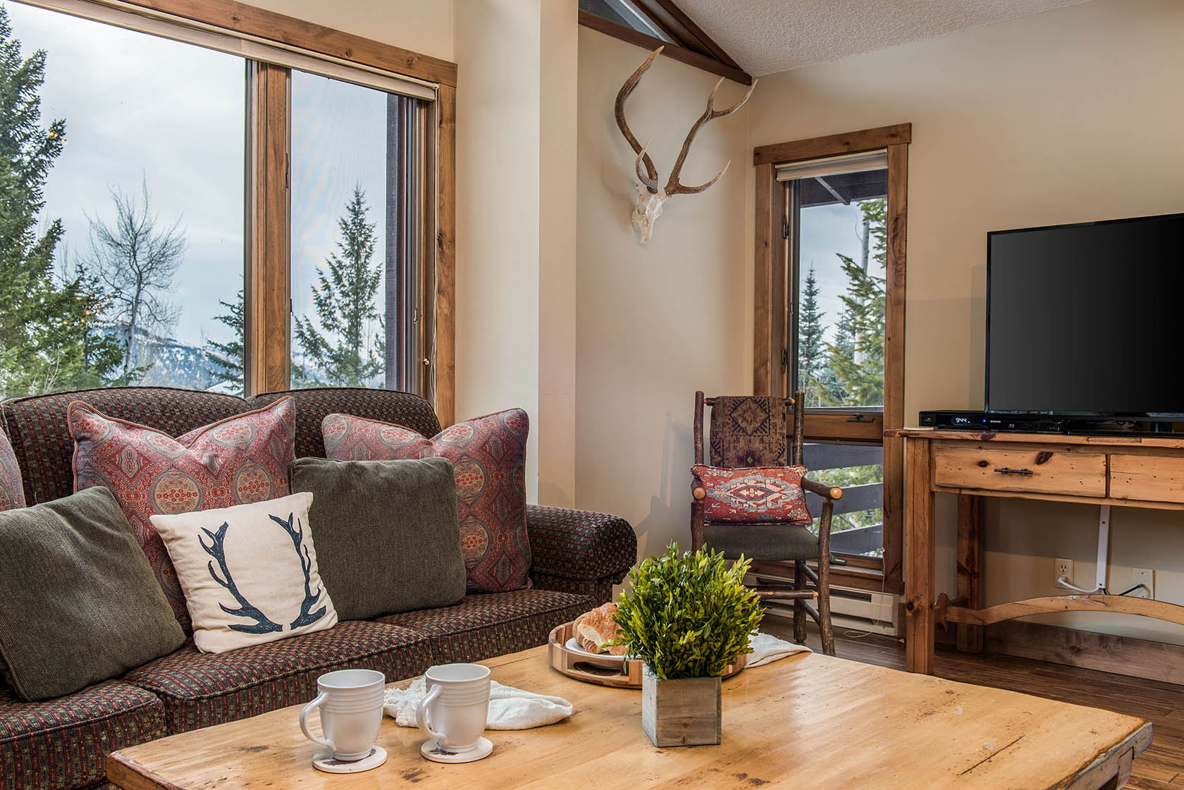 This five-bedroom, ready-to-rent, ski chalet combines old-world charm and modern access at the world-class Jackson Hole Mountain Resort. Catch a ride from the Moose Creek ski lift in the winter, or start your hike from the backyard in the summer and walk home from dinner in Teton Village. Soak in the hot tub off the downstairs master bedroom and media room, which doubles as a 6th bedroom. Two other en-suite bedrooms, one with a private deck, are separated by the three-story floor plan, providing privacy for guests. New stainless steel appliances will please the chef in the kitchen and heated floors add warmth. Curl up on the couch by the wood-burning fireplace in the den – the perfect place for an afternoon nap. The intimate dining room has a table set for eight with woodsy views out the windows.