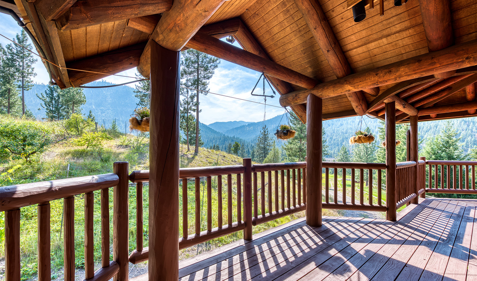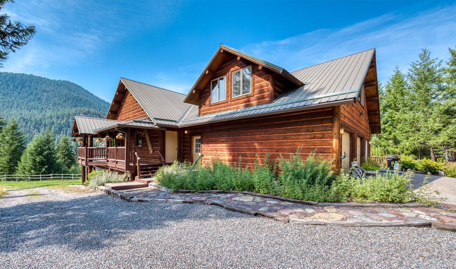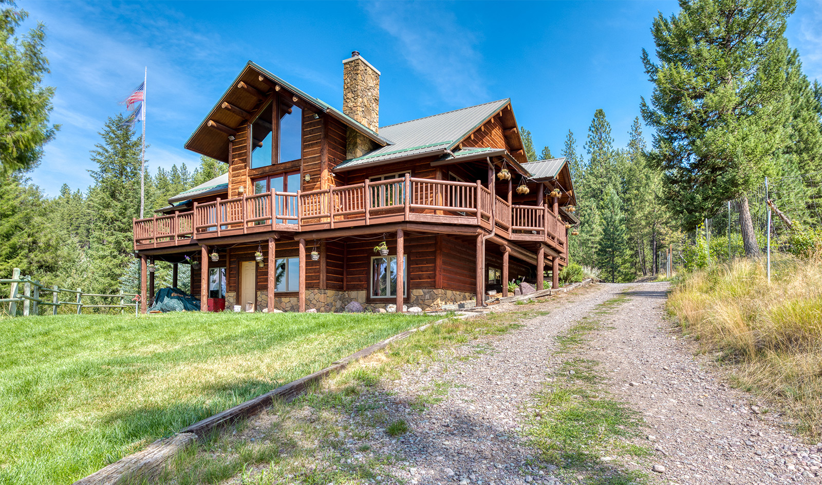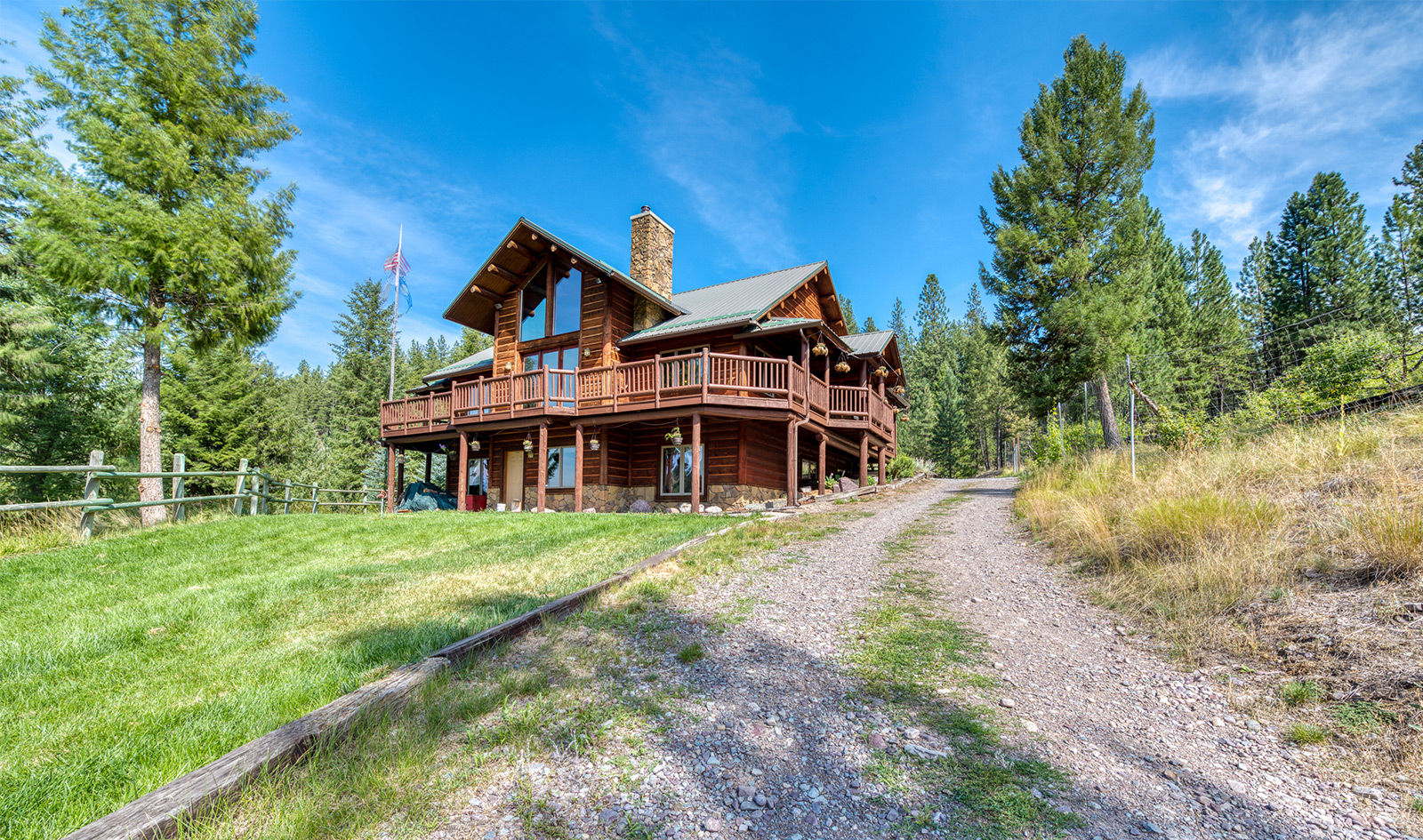 In a private location at the end of a gravel road, the Montana River Lodge overlooks the Clark Fork River about a half-hour west of Missoula.ย ย The 4,300 square foot custom log-sided home features eight bedrooms, six baths, and a floor-to-ceiling river rock fireplace.ย Large picture windows and an extensive wrap-around deck provides a quiet space to soak in the sights and sounds of the wildlife and rushing river water below.