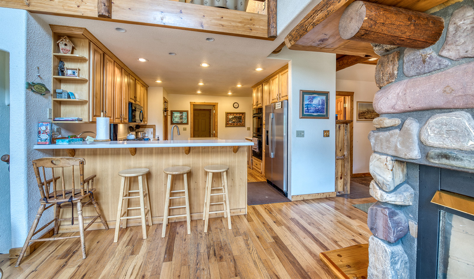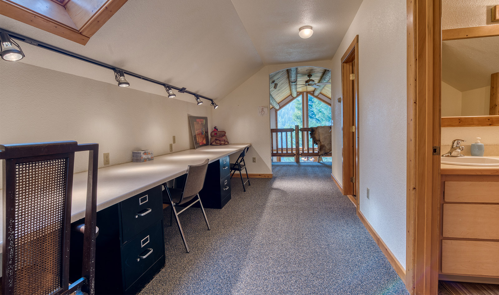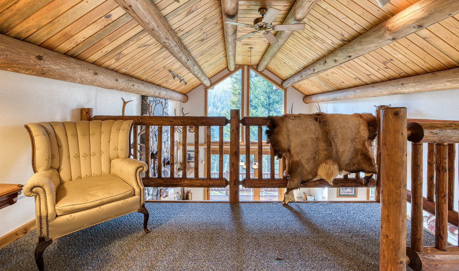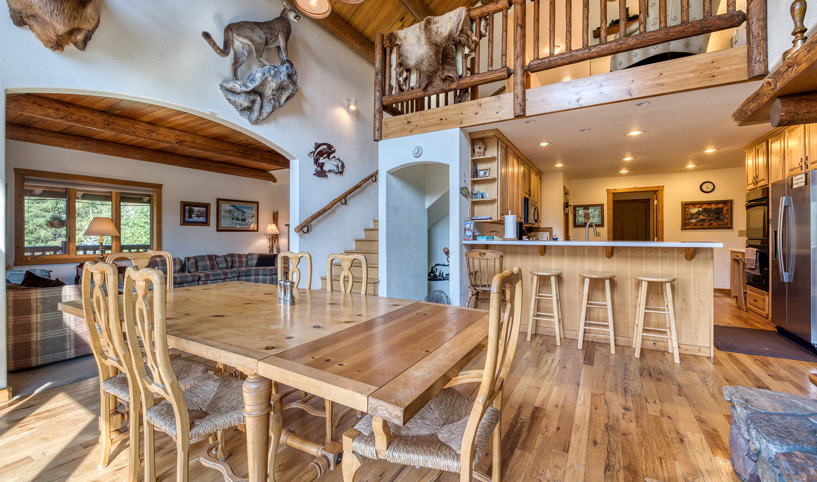 In a private location at the end of a gravel road, the Montana River Lodge overlooks the Clark Fork River about a half-hour west of Missoula.ย ย The 4,300 square foot custom log-sided home features eight bedrooms, six baths, and a floor-to-ceiling river rock fireplace.ย Large picture windows and an extensive wrap-around deck provides a quiet space to soak in the sights and sounds of the wildlife and rushing river water below.