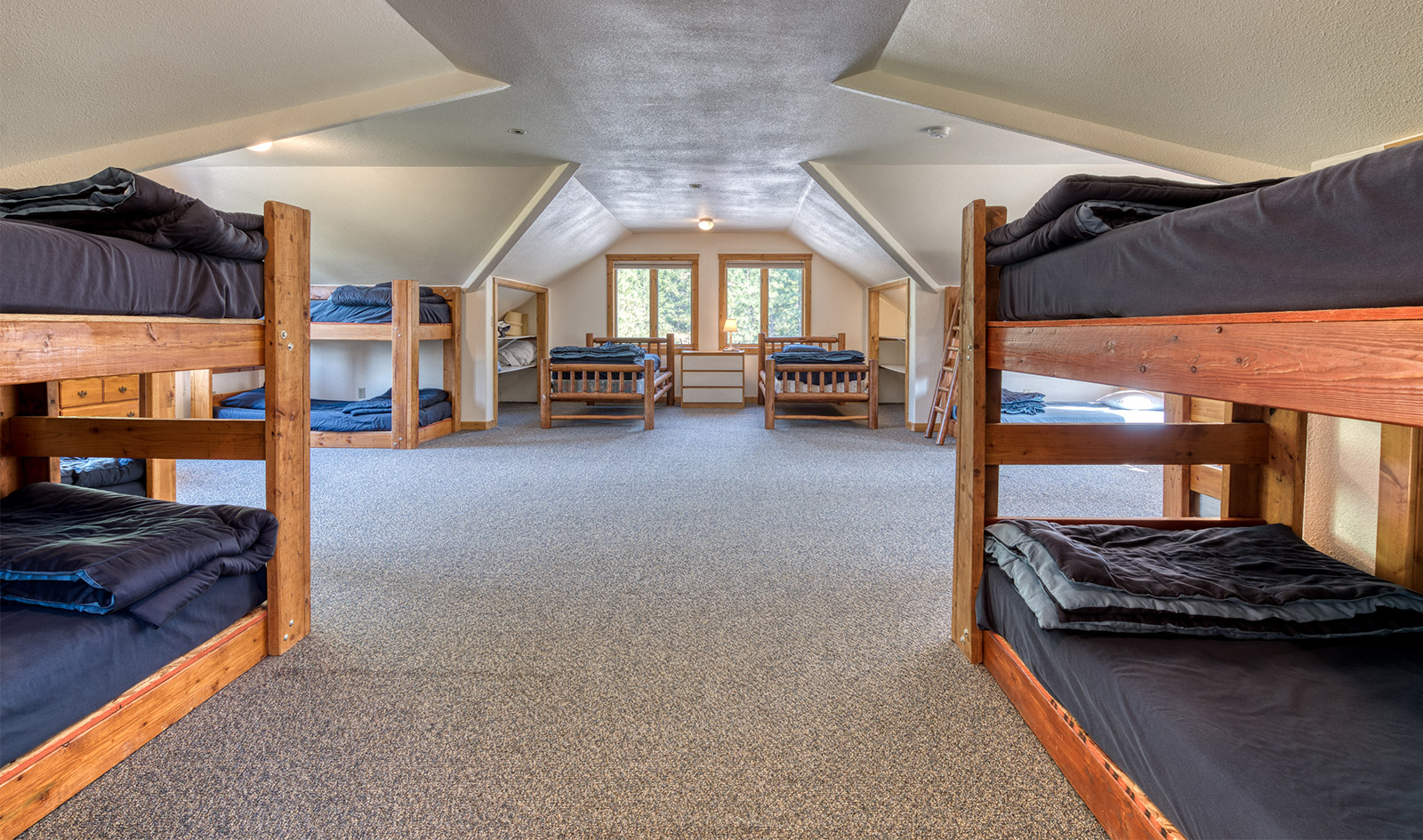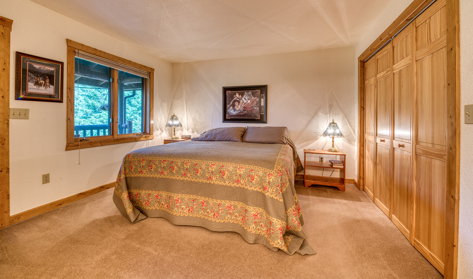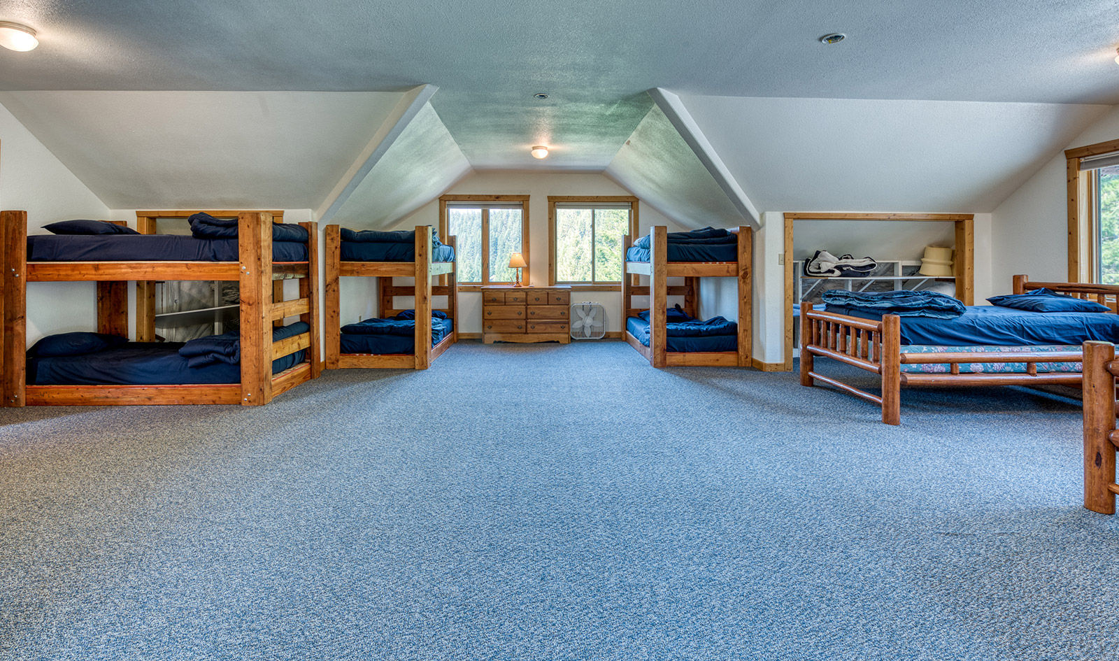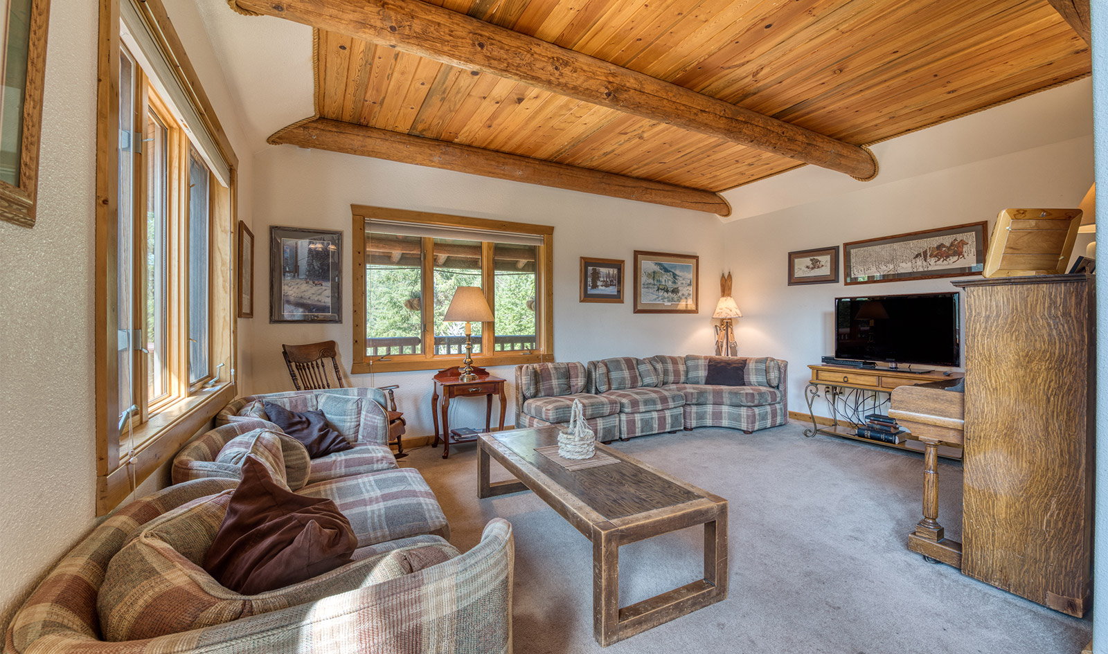 In a private location at the end of a gravel road, the Montana River Lodge overlooks the Clark Fork River about a half-hour west of Missoula.ย ย The 4,300 square foot custom log-sided home features eight bedrooms, six baths, and a floor-to-ceiling river rock fireplace.ย Large picture windows and an extensive wrap-around deck provides a quiet space to soak in the sights and sounds of the wildlife and rushing river water below.