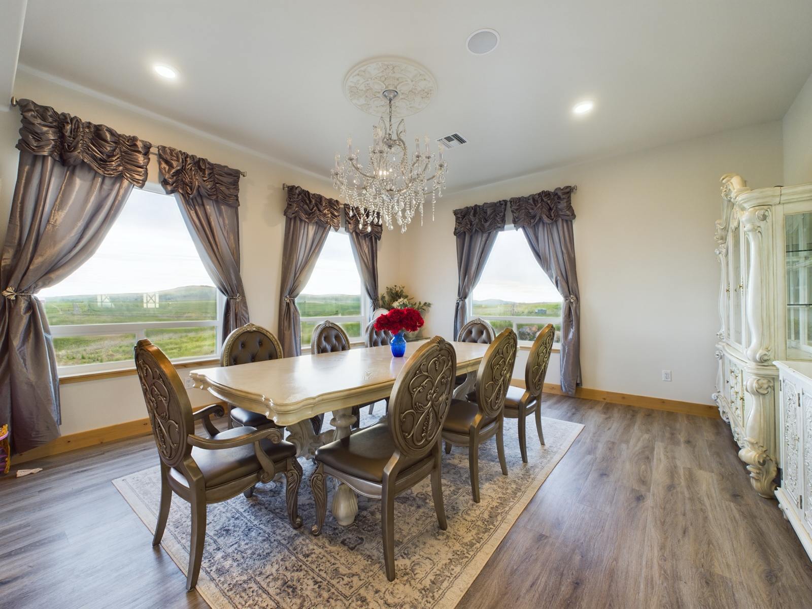 The 6,912 sqft home is positioned overlooking deep canyons, surrounded by farmland on the Camas Prairie. It features four spacious bedrooms, six-bathrooms, and an elegant interior that combines comfort with privacy. The kitchen boasts custom cabinetry, while the living room offers stunning sunset views through large windows. The luxurious master suite includes a walk-in closet and an exemplary bathroom, with additional bedrooms and a playroom upstairs. The home also has a theater room, private library, radiant heated floors, and a mudroom connected to a four-car garage. The Ranchโs main shop is heated with a hybrid wood-burning stove. It includes separate wood and metalwork rooms, a commercial kitchen, a solar array, and a diesel generator for backup power. A 1,600 sqft second-floor residence includes a spacious deck with incredible views. The 60×80โ hay barn has an open-span roof, tack room, and covered stables. Additional facilities include a 16×32โ greenhouse, 30×40โ poultry barn with outdoor pens, and two covered rifle ranges, one extending to a mile.
